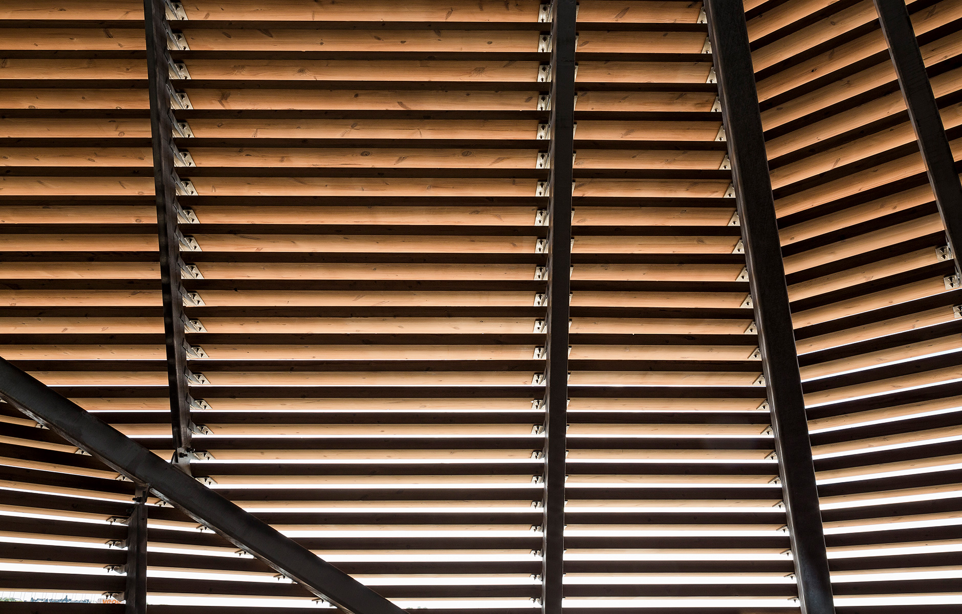 Although Löyly cuts a modest figure down on the Baltic waterfront, its shape and materials are inspiring. Steel, black concrete and glass work in beautiful harmony – but the main material is wood. What defines the building are the over 4,000 heat-treated panels of Laminated Veneer Lumber, made from specially cut pine veneers, which clad the whole of the building and also make up the large terrace. This grade and type of wood was chosen for its dimensional stability, even when exposed to the harsh coastal climate of Finland. However, addition precautions were also taken – the cladding is tilted so rain and meltwater run off, and in winter the terraces are closed and covered.
