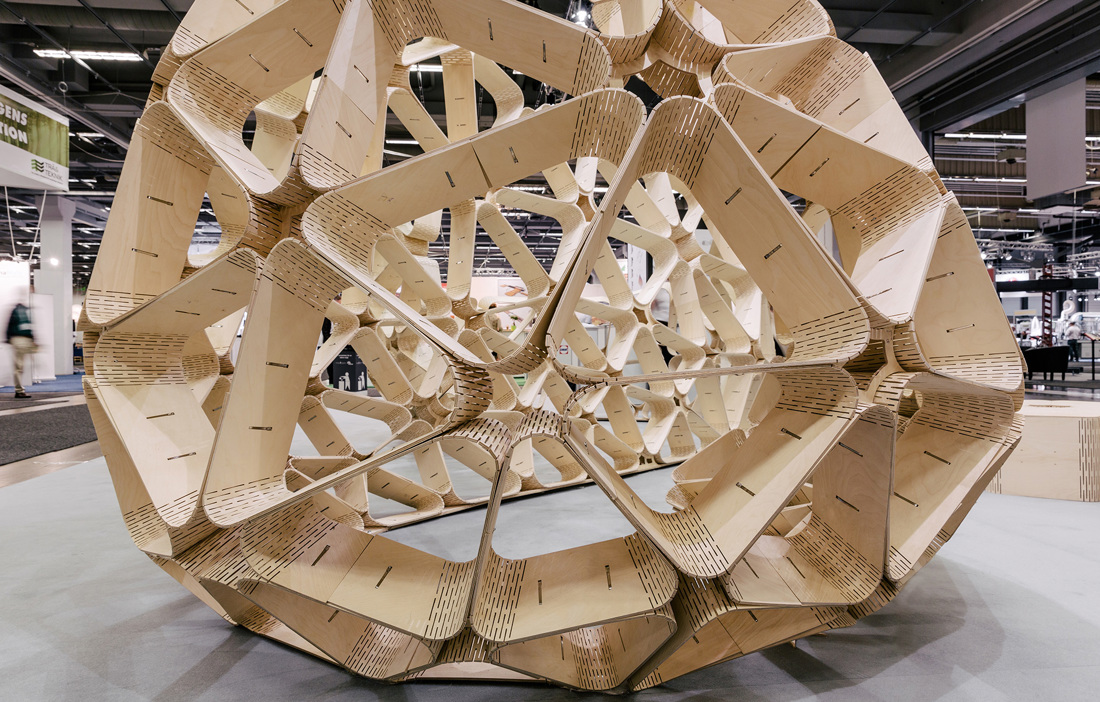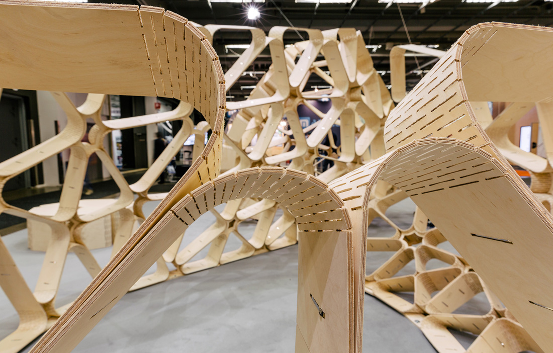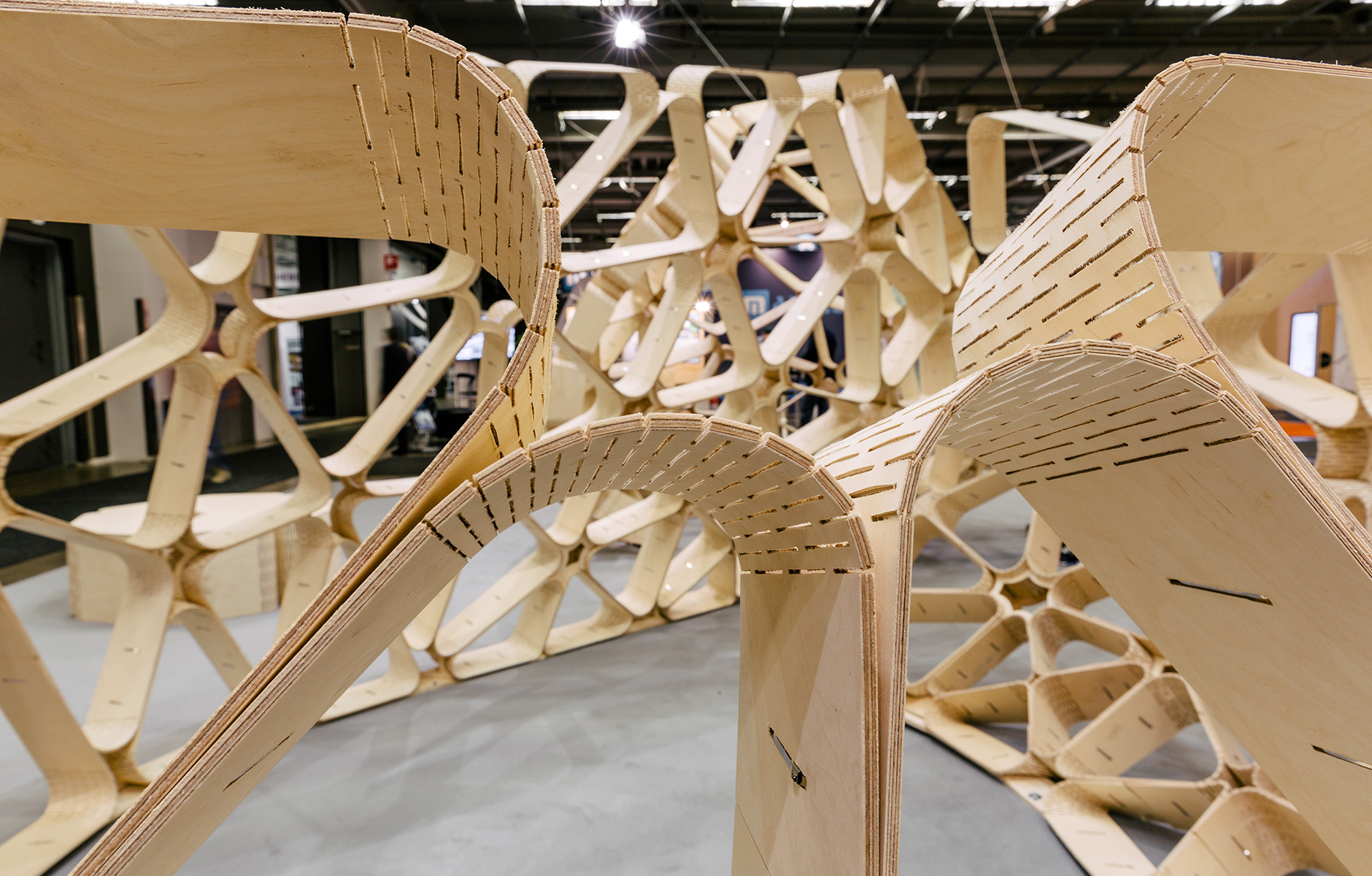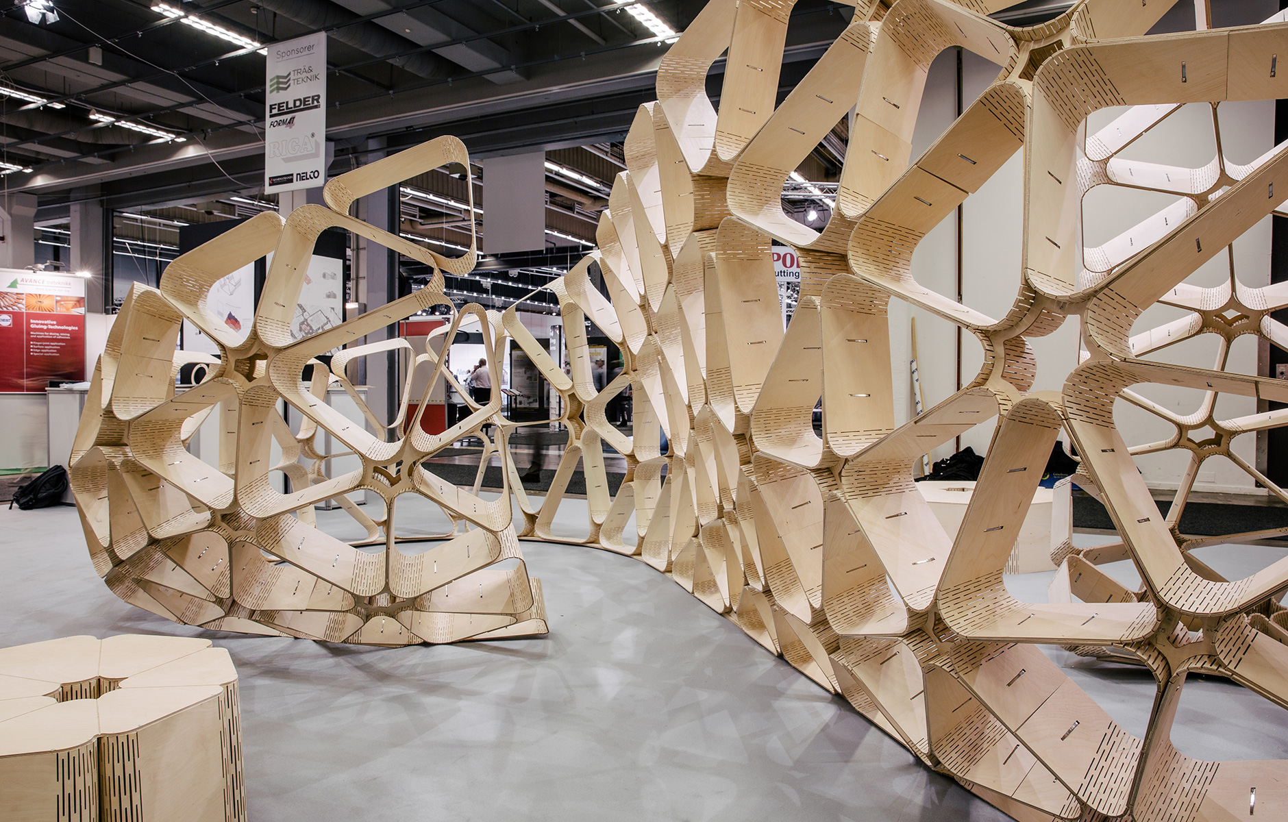 The design comprises a large number of triangles with gently rounded corners and angled edges. These are held together by slim steel ribbons that lock everything into place. To achieve the gently rounded shape, each triangle has its own unique angles. The parts were then cut out using a three-axis CNC milling machine. The students experimented with several different types of plywood before finally choosing Swedish birch plywood.