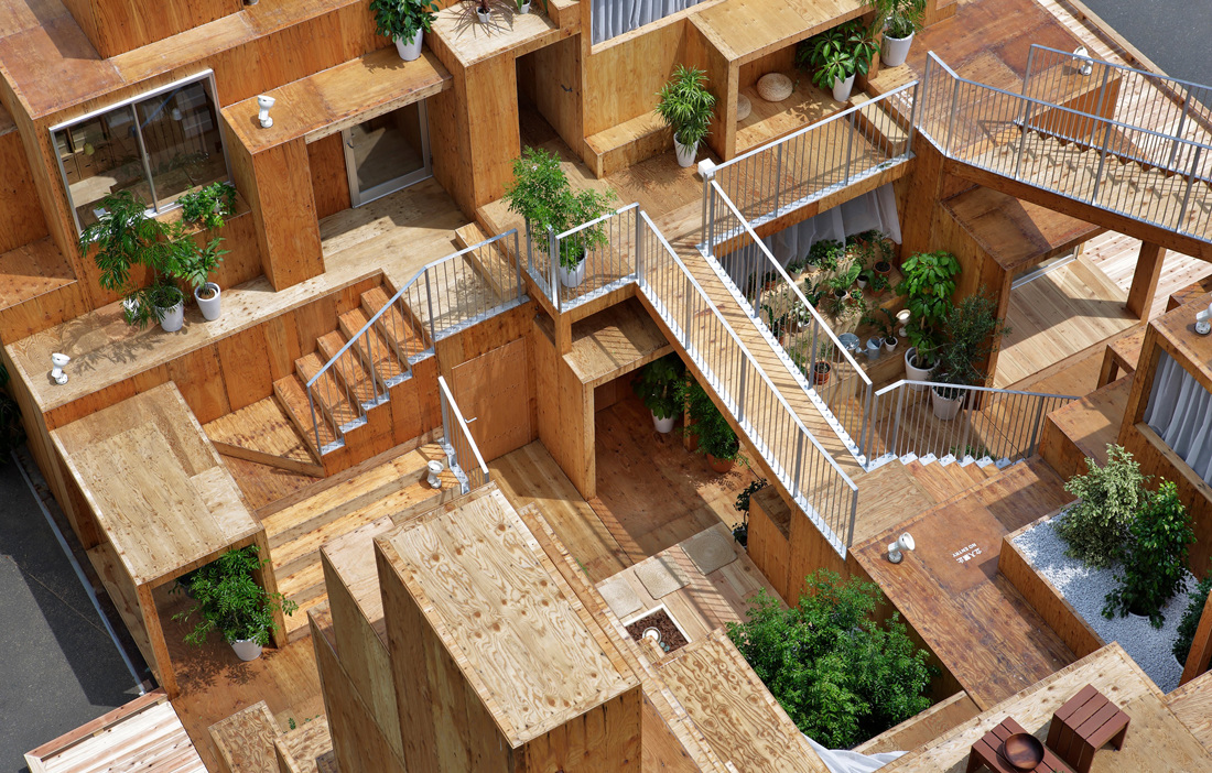 With his pavilion for the Tokyo-based housing fair House Vision 2016, Sou Fujimoto turned the idea of the classic rental housing block inside out. The theme for the fair in August was “Co-individual”. The succinctly named pavilion “Rental space tower” showcases an alternative way for many people to live in a small space. The usual approach is to go for well proportioned private living spaces and a few small communal areas. Here the reverse is true. Those who live in Fujimoto’s concept building can forget about the idea of their own living room, for example. There are also zones of planting and the food preparation area is shared by the residents. Between the minimal apartments, generous spaces for relaxation, socialising and spontaneous meetings spread out both horizontally and vertically. The sugarloaf shaped structure is constructed from traditional plywood on a spruce frame.
