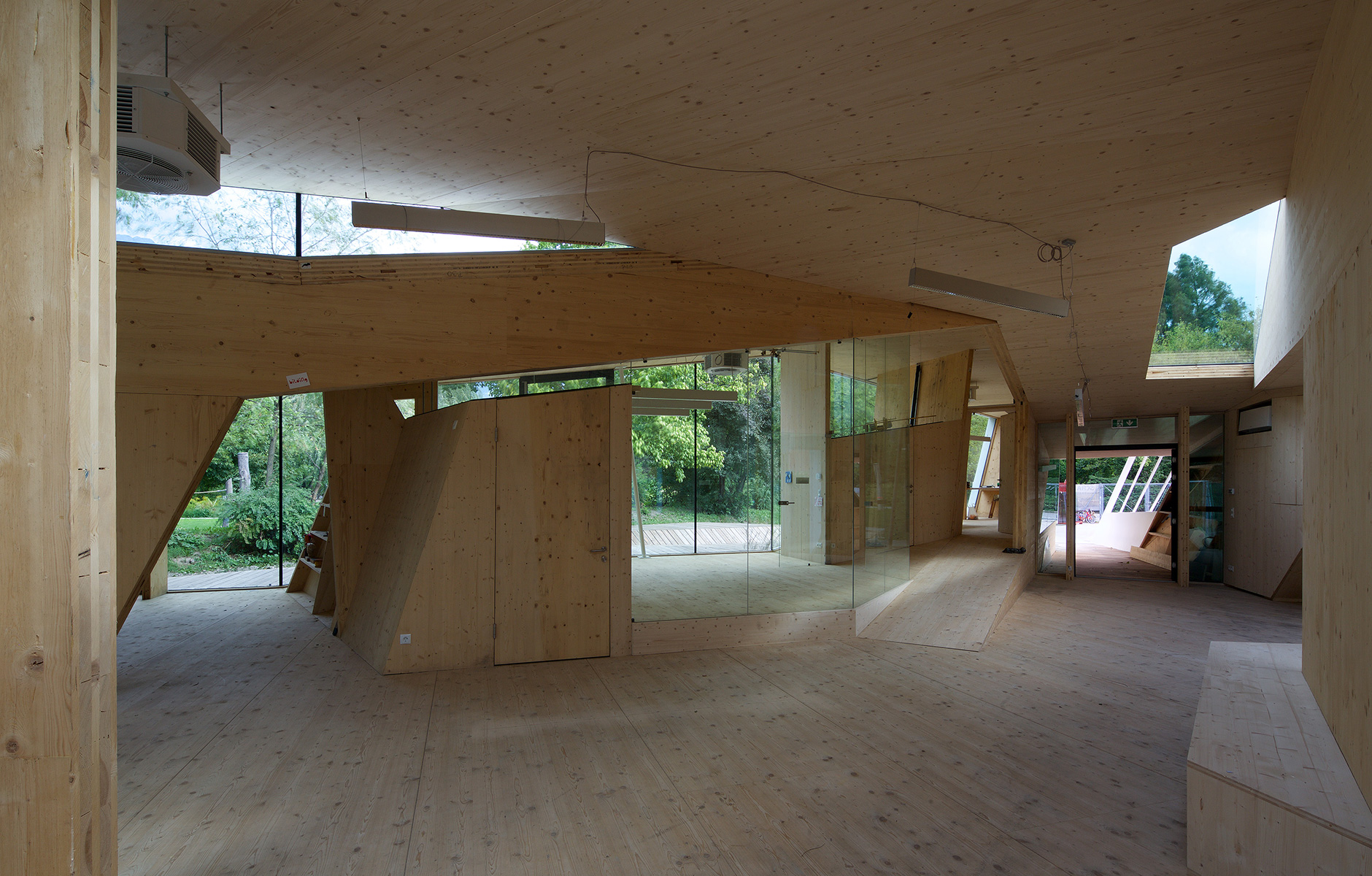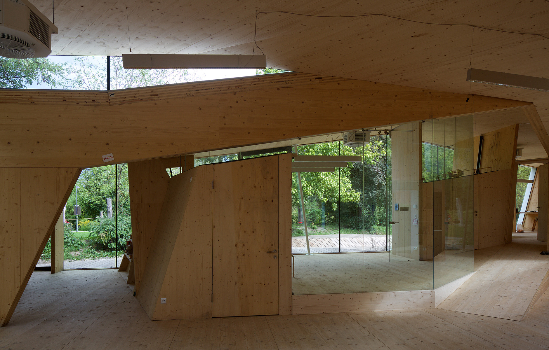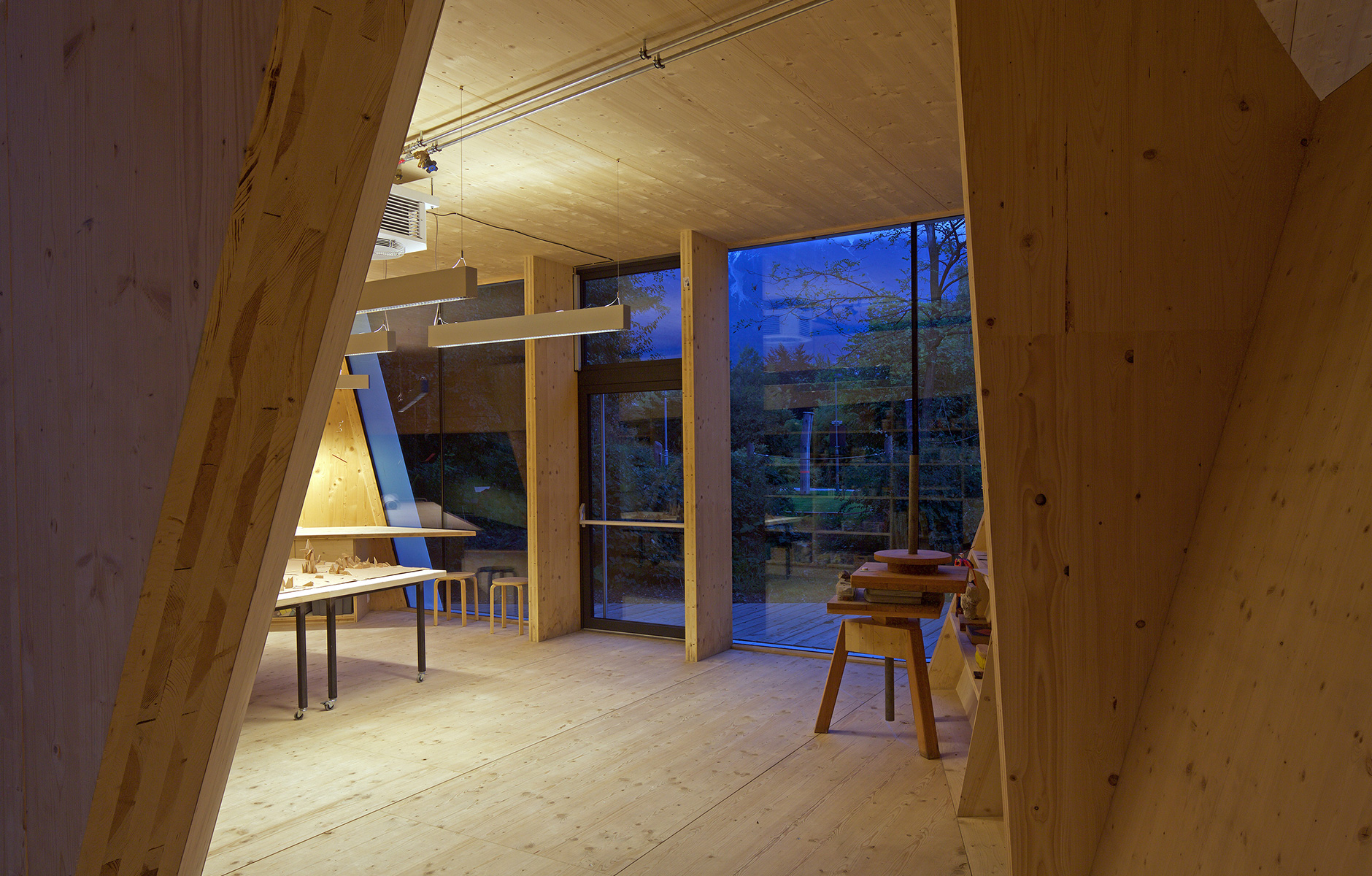 The building is made from crosslam on a concrete foundation. On the outside, the façade is covered in a white plastic material that forms a protective shell. Large expanses of glass ensure that enough daylight reaches the people who are taking part in the building’s activities: sculpture and painting workshops, courses in architecture and fashion design, and so on. The interior joinery is made from untreated Austrian spruce. 27 students and a number of supervisors in the form of structural engineers and architects took part in the build, which took five months.