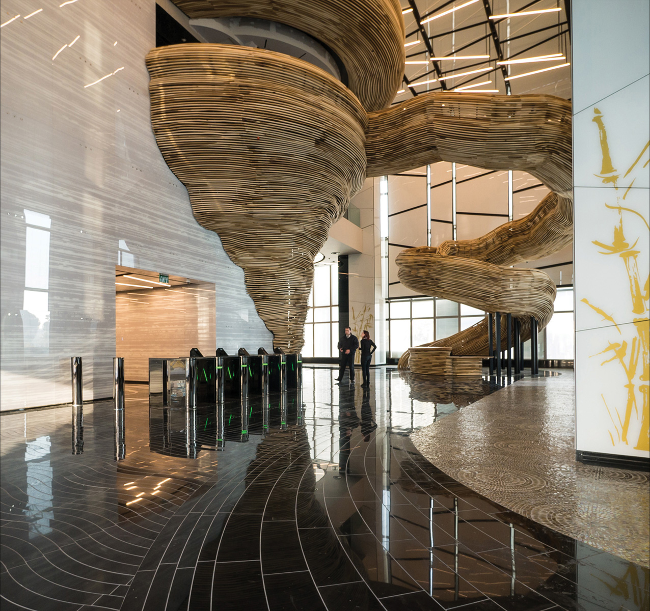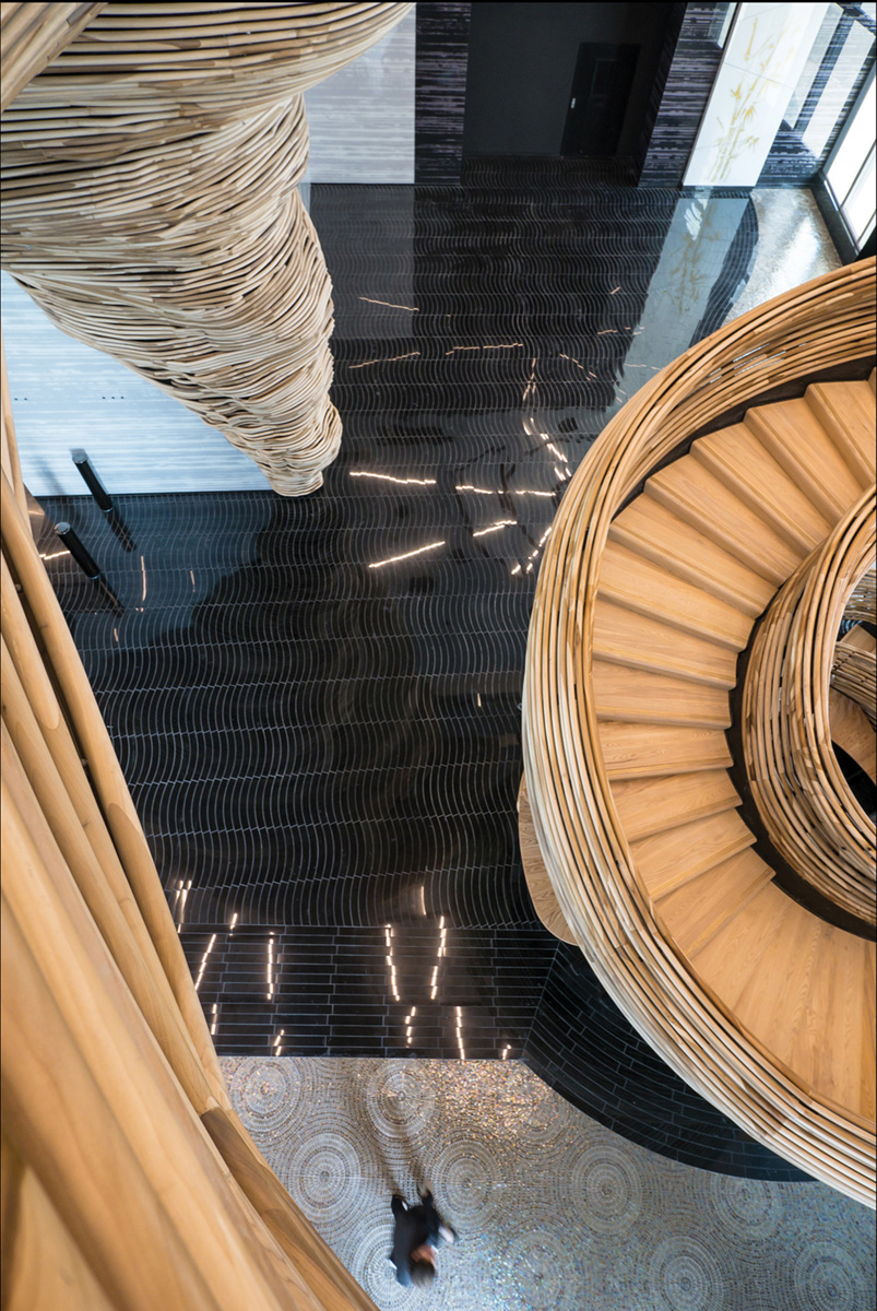 Blending neo-modernism and local style, architect Oded Halaf has created a 14 metre-high installation and staircase in the lobby of the Amot Atrium Tower. Dubbed “the Tornado”, the staircase strives to establish a warm and organic feel in the large lobby of the skyscraper. Being on the staircase is not about moving from one floor to another, but about an ever-changing experience with every step you take.