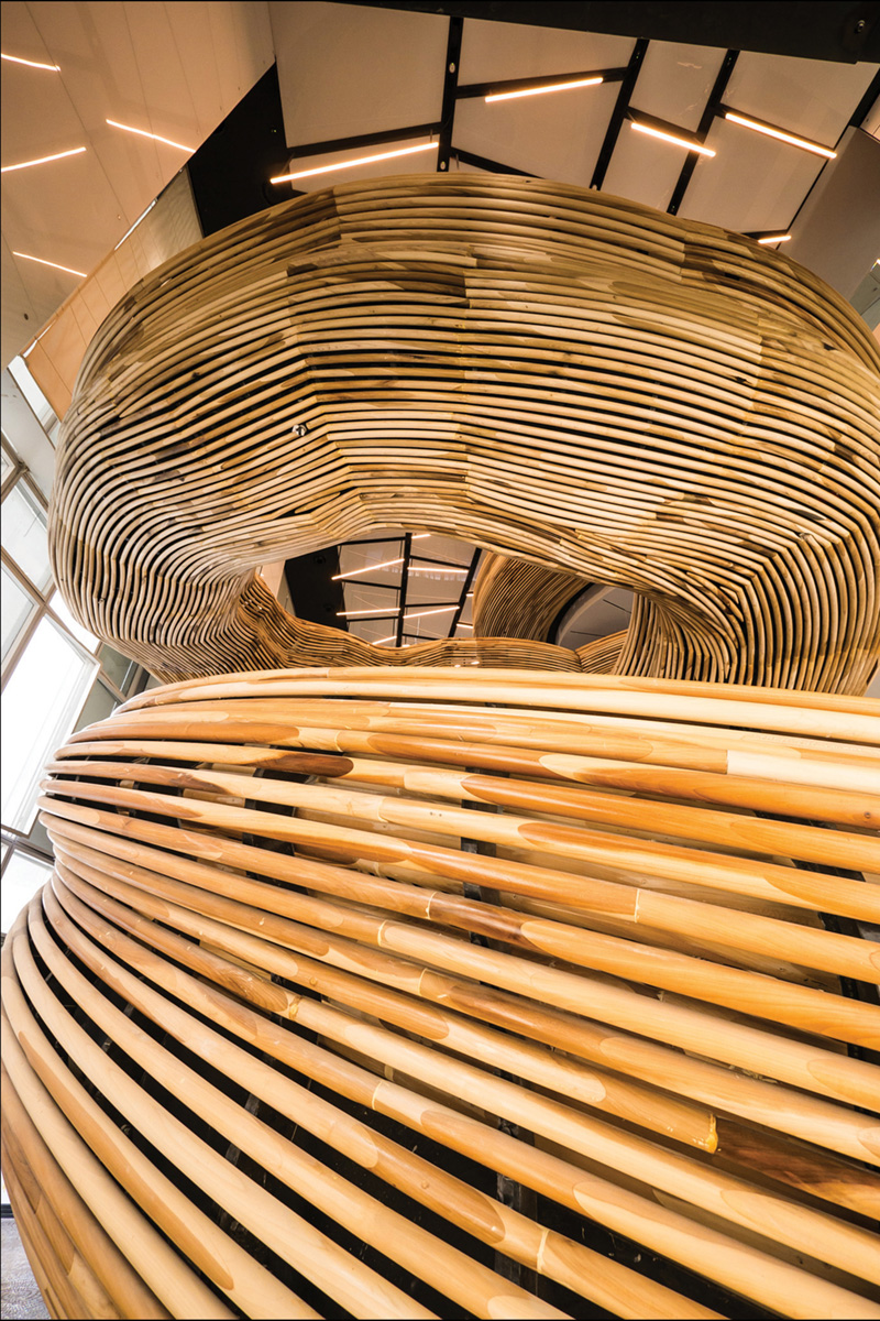 The staircase comprises two parts: a reception desk that transitions into a wide spiral staircase, which joins up with a tornado-like volume to form a viewing platform. The load-bearing structure is a mix of a metal skeleton and glulam made from American tulipwood. The outside is then clad in 9,000 metres of CNC milled curved components, also in tulipwood. One clear feature of tulipwood is its considerable colour variation. The harvested wood was sorted into 12 different shades to be used in different parts of the cladding.
