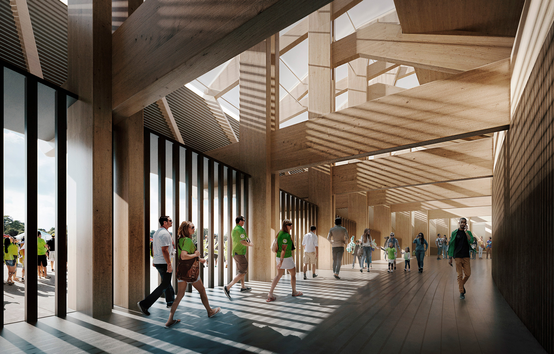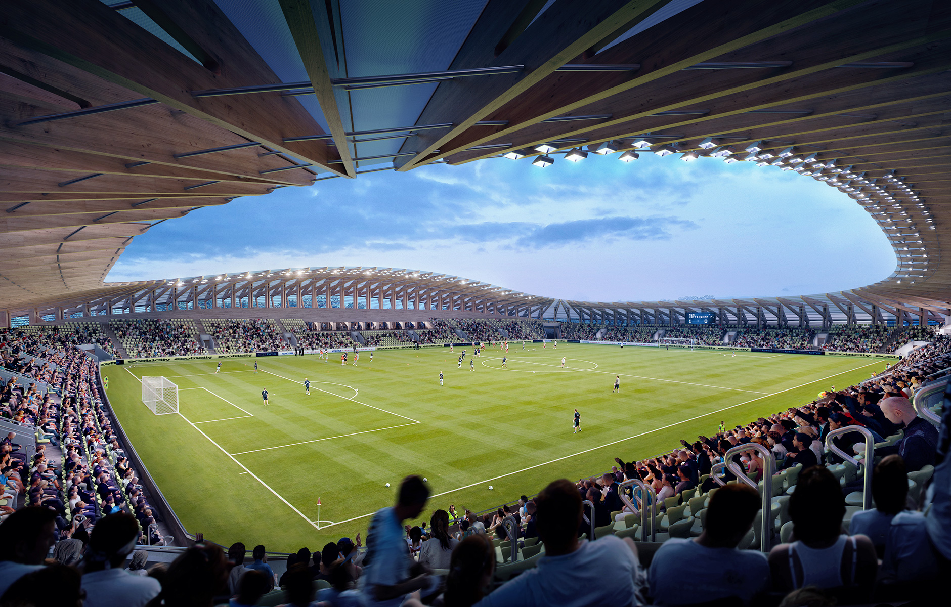 Almost all of the stadium, from the structural frame and the roof brackets to the screen that clads the exterior, will be sourced from sustainably managed forests. The design of the load-bearing structure allows even the stands and the floor components to be made of wood. The roof will be clad in a thin transparent membrane that allows enough light through to keep the grass pitch healthy. The club calculates that their new arena will have the lowest carbon footprint of any football stadium in the world.
