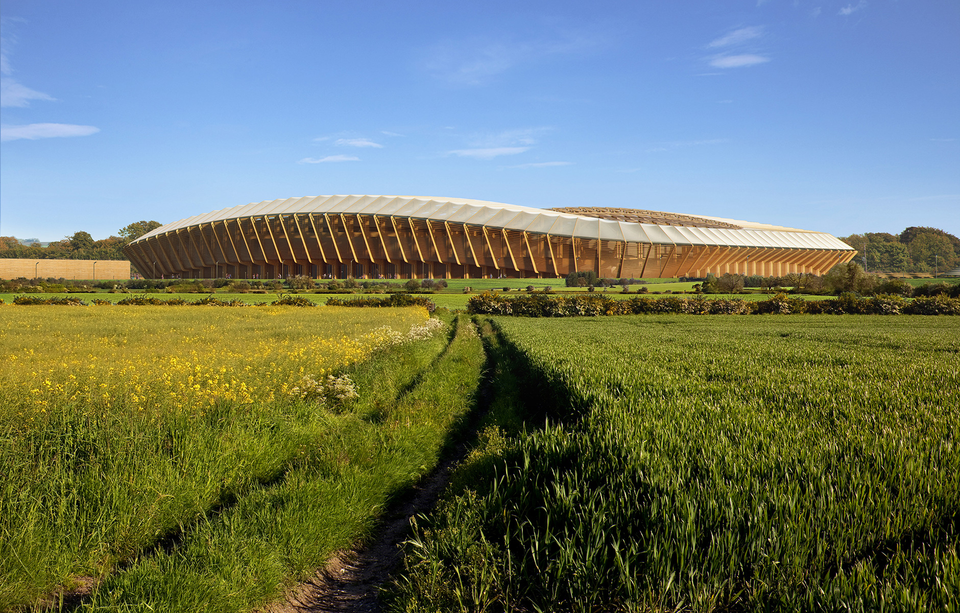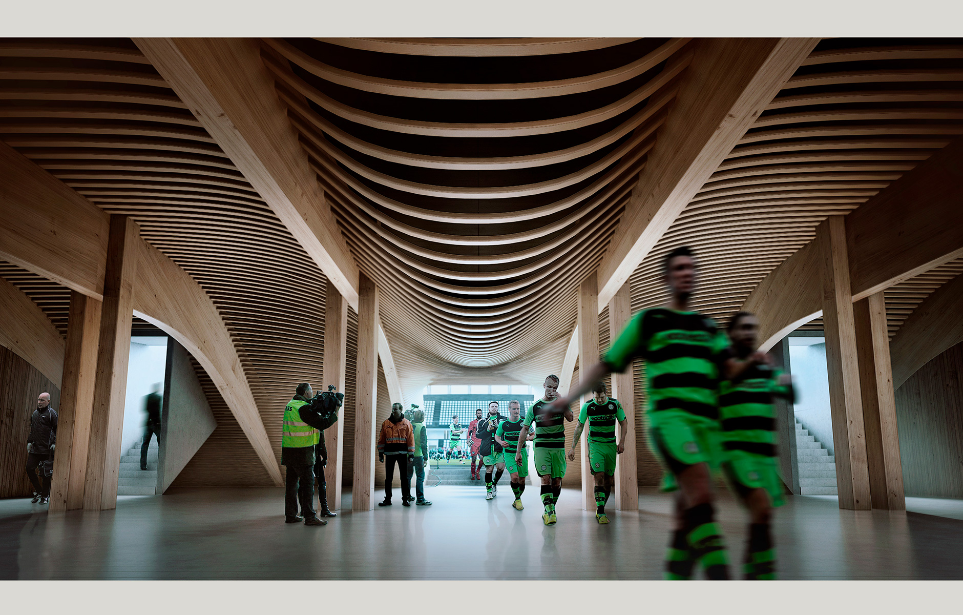 The British football club Forest Green Rovers is getting a new stadium. The winner of the major international competition was Zaha Hadid Architects, whose entry was a stadium built almost entirely of wood. In phase 1, the stadium will have capacity for 5,000 spectators, with the option of expanding this to 10,000 seats when the club reaches the higher leagues.