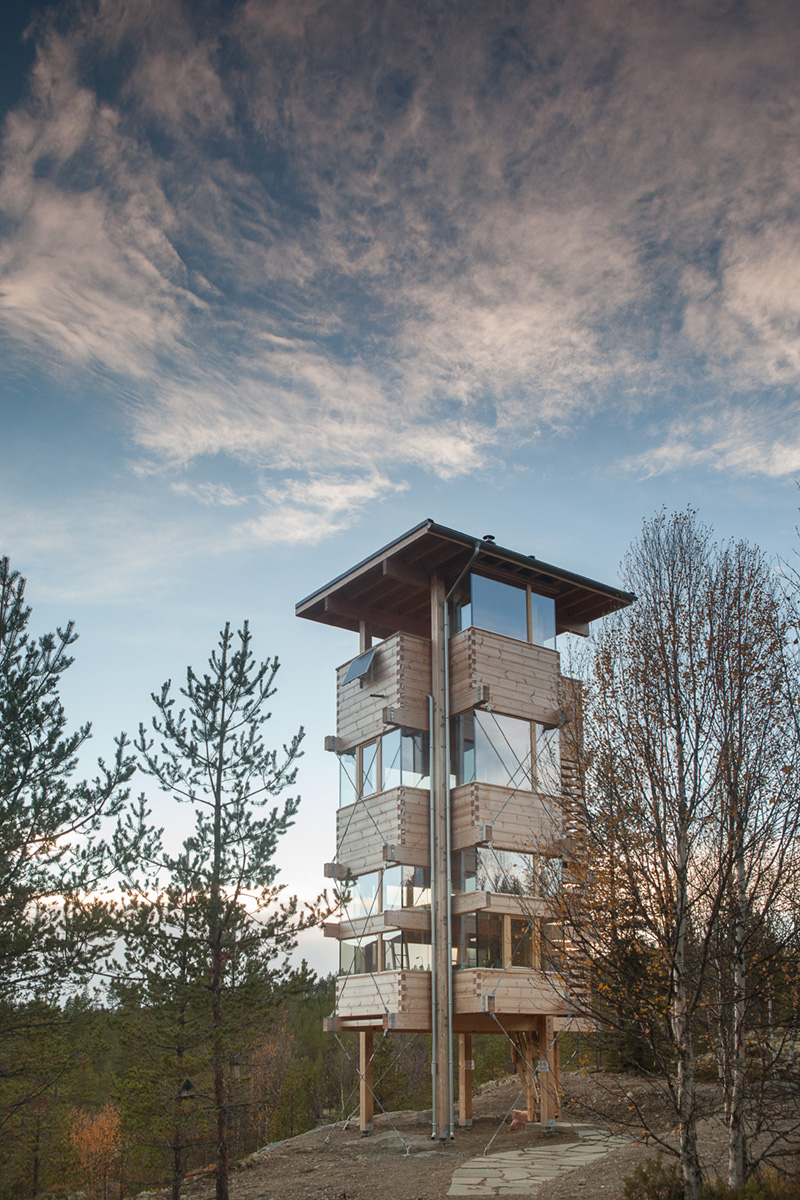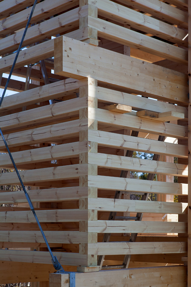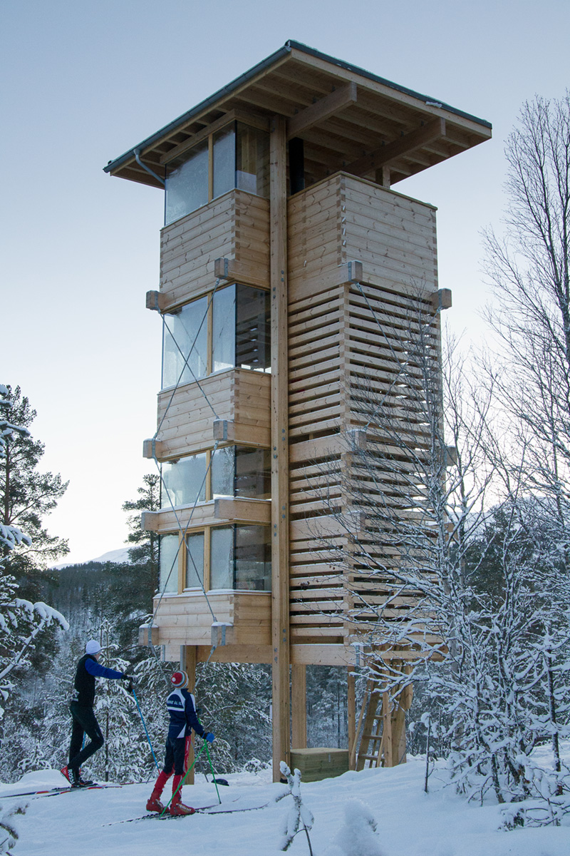 The prefabricated tower was erected as a modern interpretation of the log cabin. The dovetailed timbers are stacked directly on top of a glulam structural frame. All the structural components are light enough for two people to handle. The parts also had to be transported to the site using snow scooters.