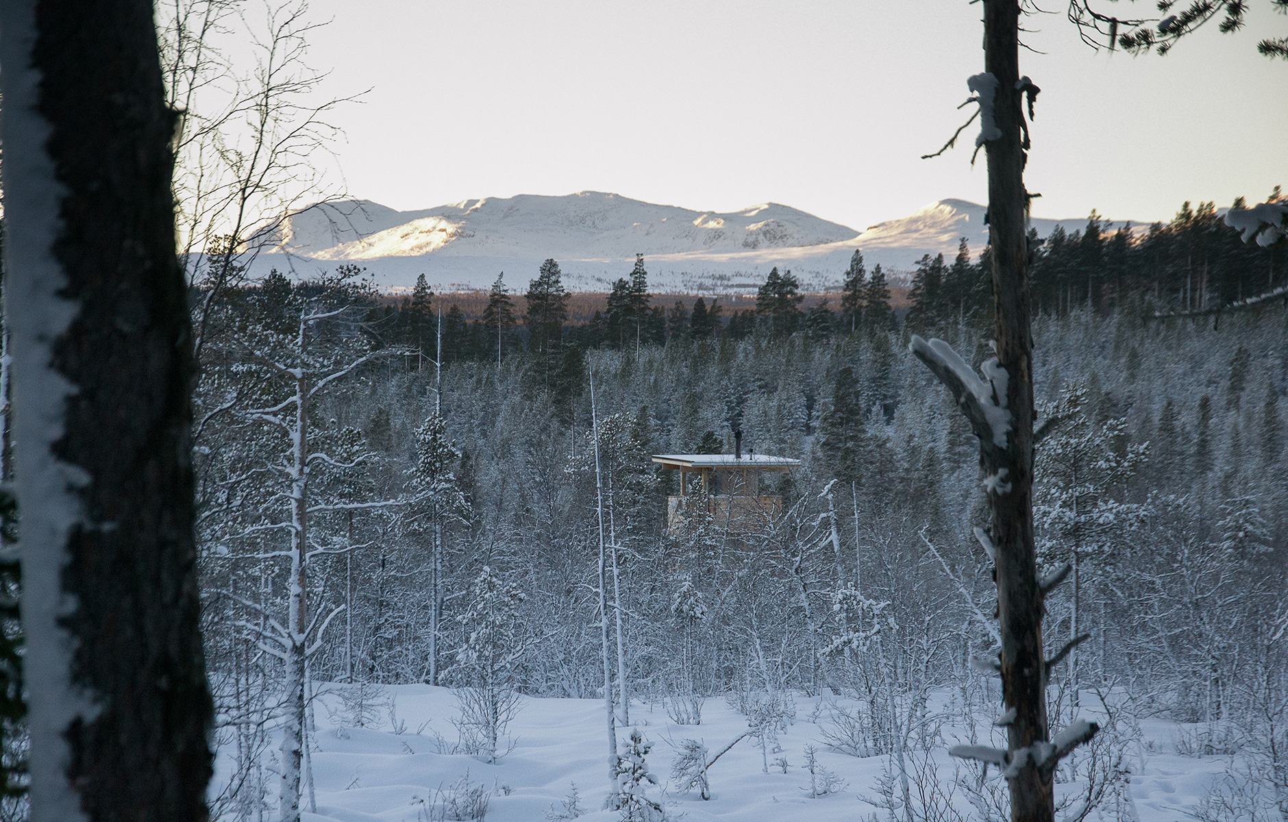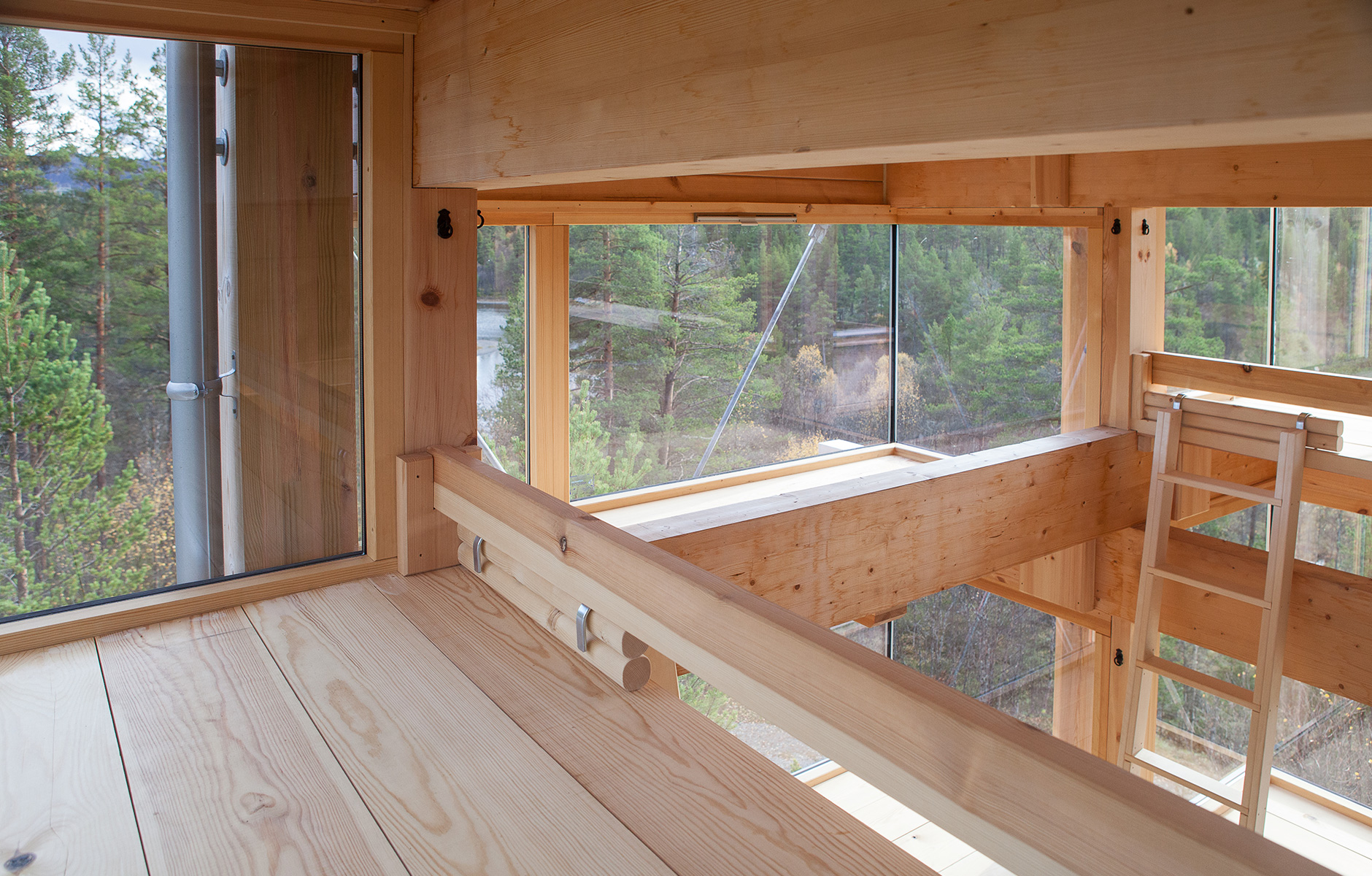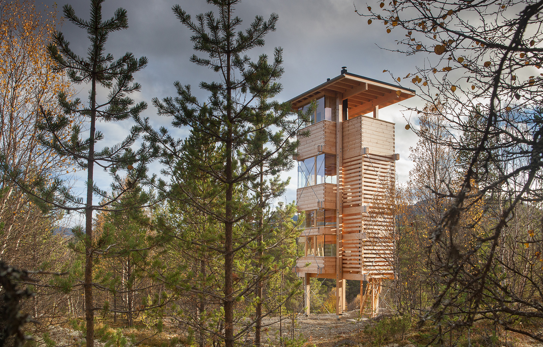 The prefabricated tower was erected as a modern interpretation of the log cabin. The dovetailed timbers are stacked directly on top of a glulam structural frame. All the structural components are light enough for two people to handle. The parts also had to be transported to the site using snow scooters.