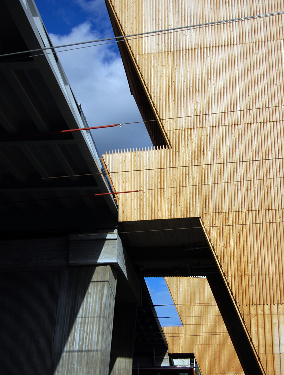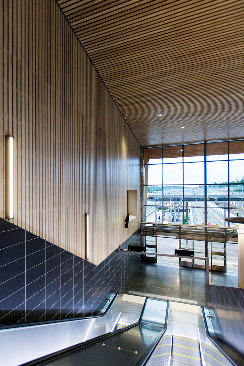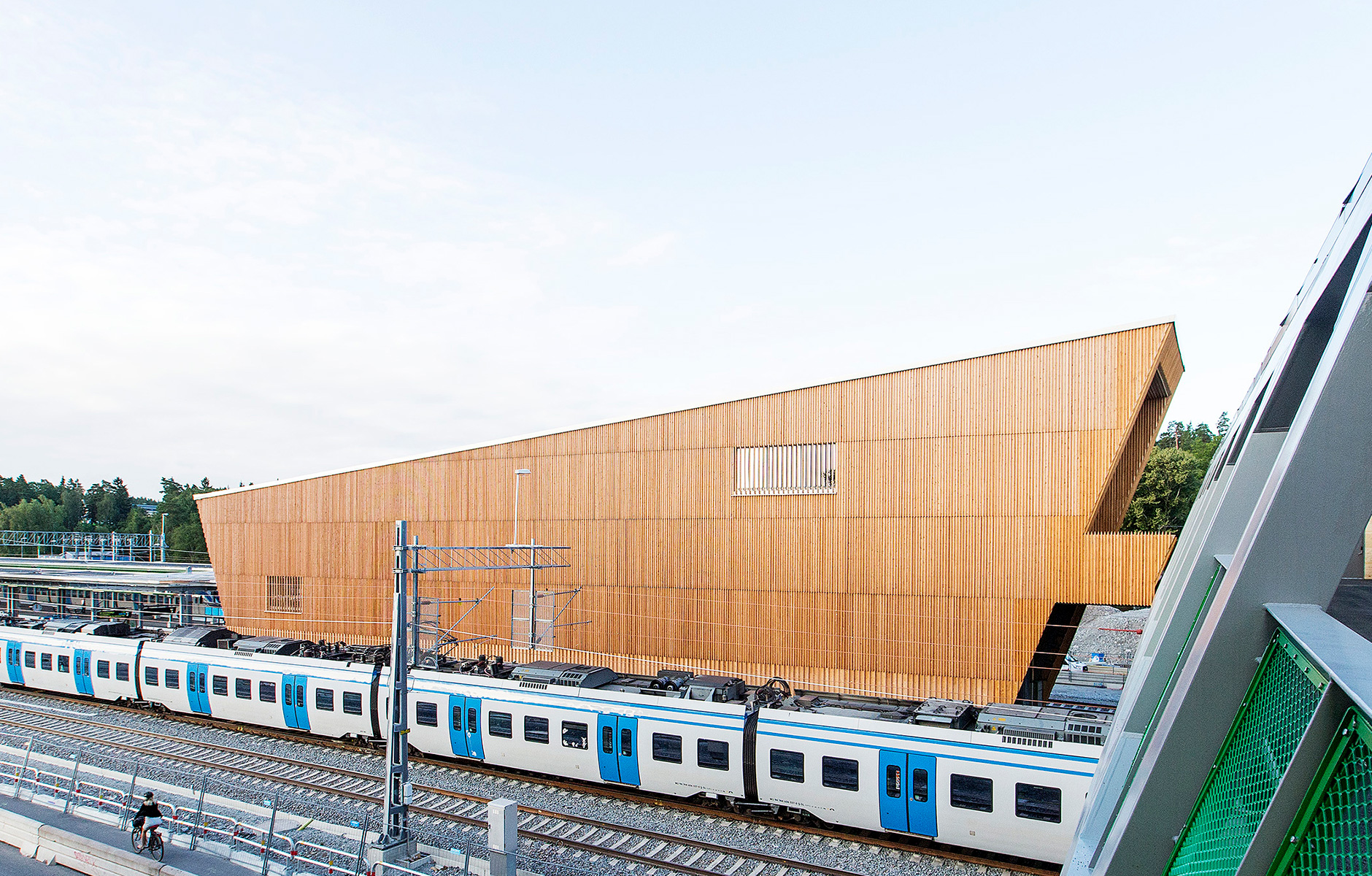 The architectural practice &Rundquist designed the new station building and the adjacent bridge. The station entrance is clearly discernible where the wood meets the bridge in a distinct line.