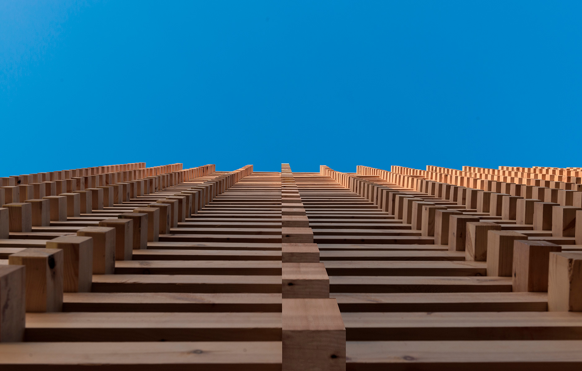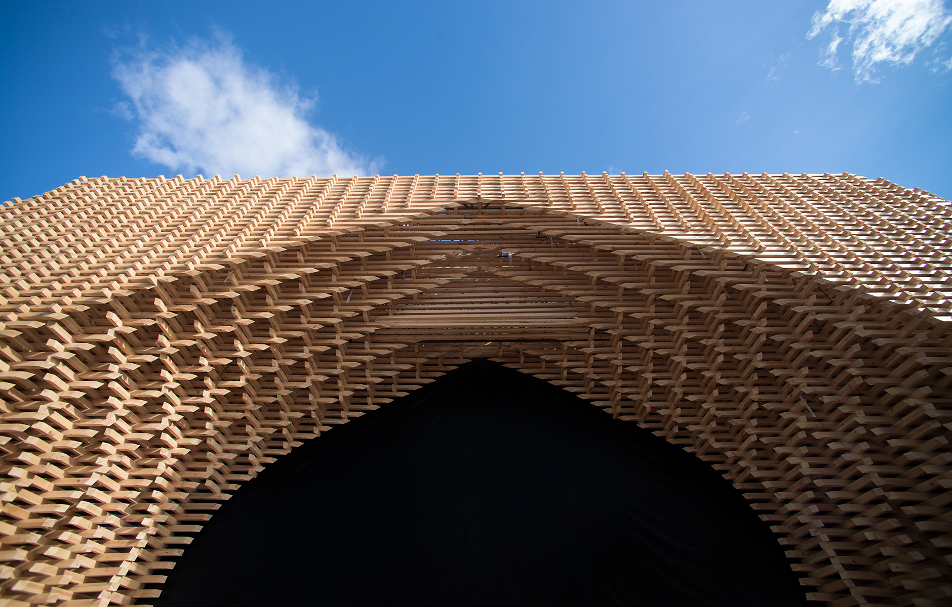 At the latest climate conference, COP22, Stephane Malka and Oualalou+Choi constructed a light wooden structure that became a magnificent installation. Sawn beams measuring 75 x 100 millimetres were loosely stacked to create a structure 15 metres tall and 50 metres wide around the entrance to the old medina in Marrakesh.