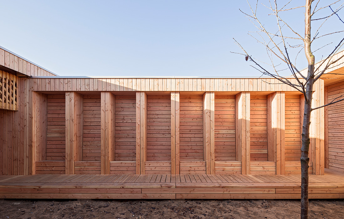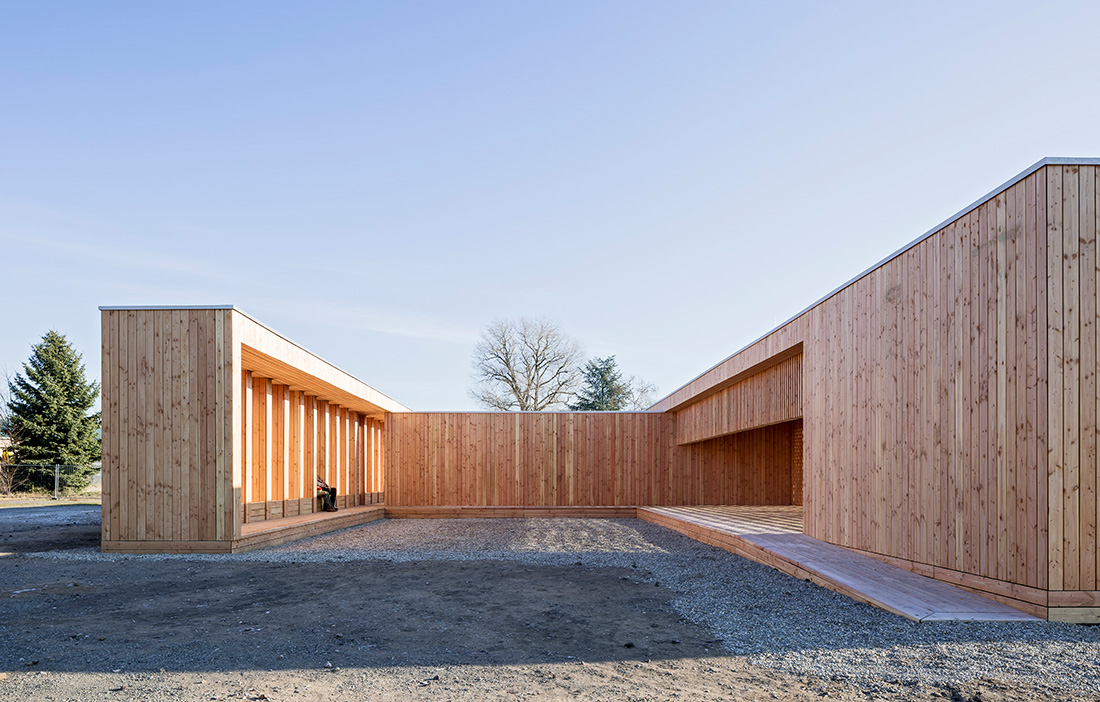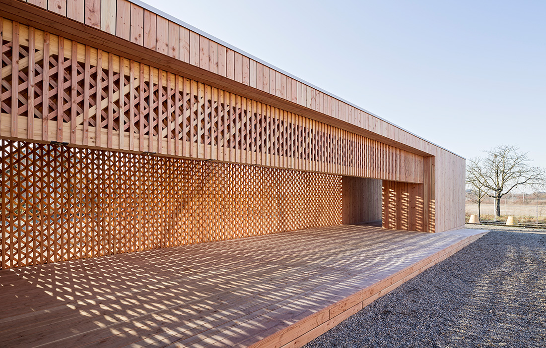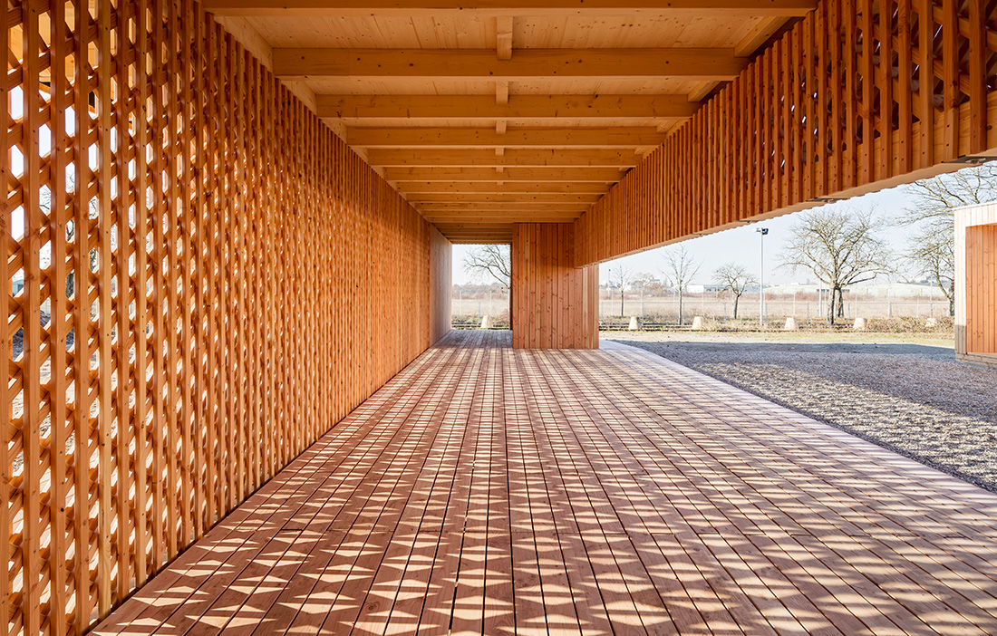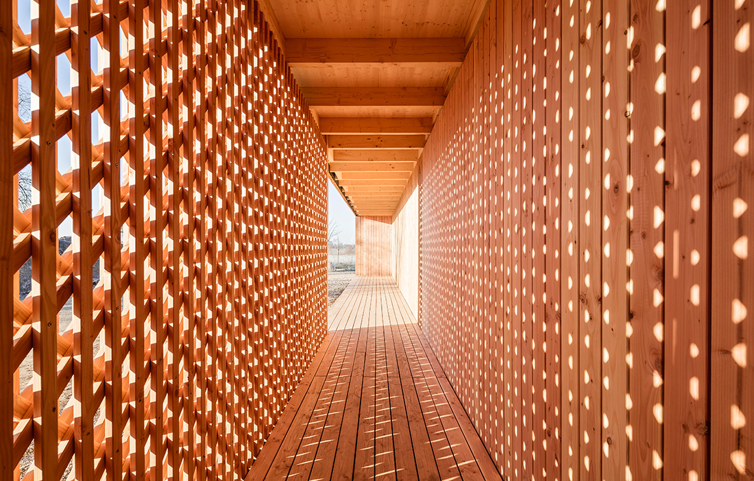 The building’s most striking feature is the open, partially load-bearing screens that let in light while protecting privacy. These are made from battens of Douglas fir in five layers. At the openings, thicker dimensions of timber are used to absorb larger forces. A sturdier load-bearing framework structure is concealed within the screens.