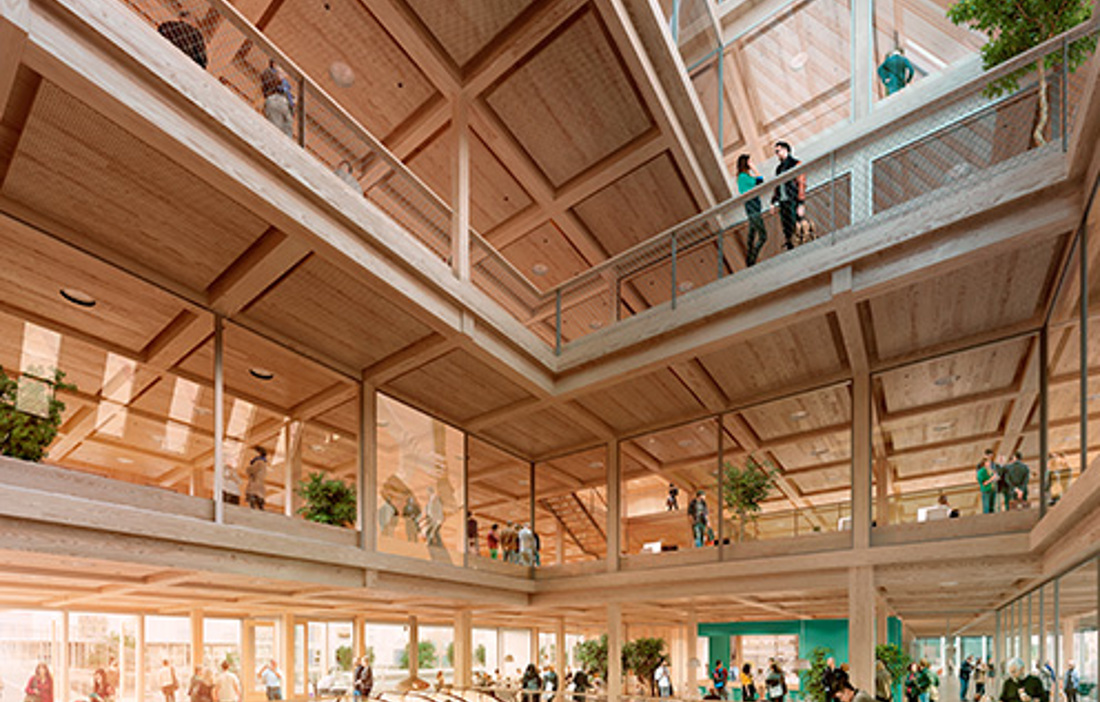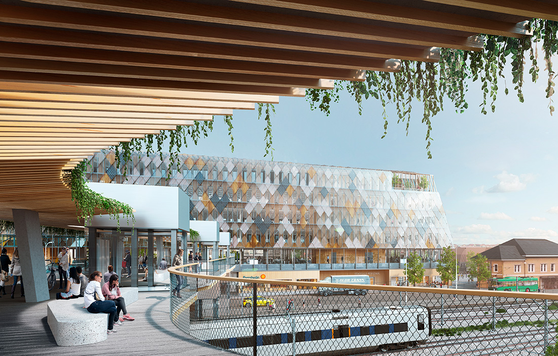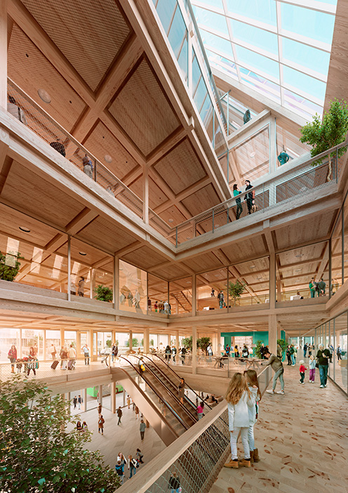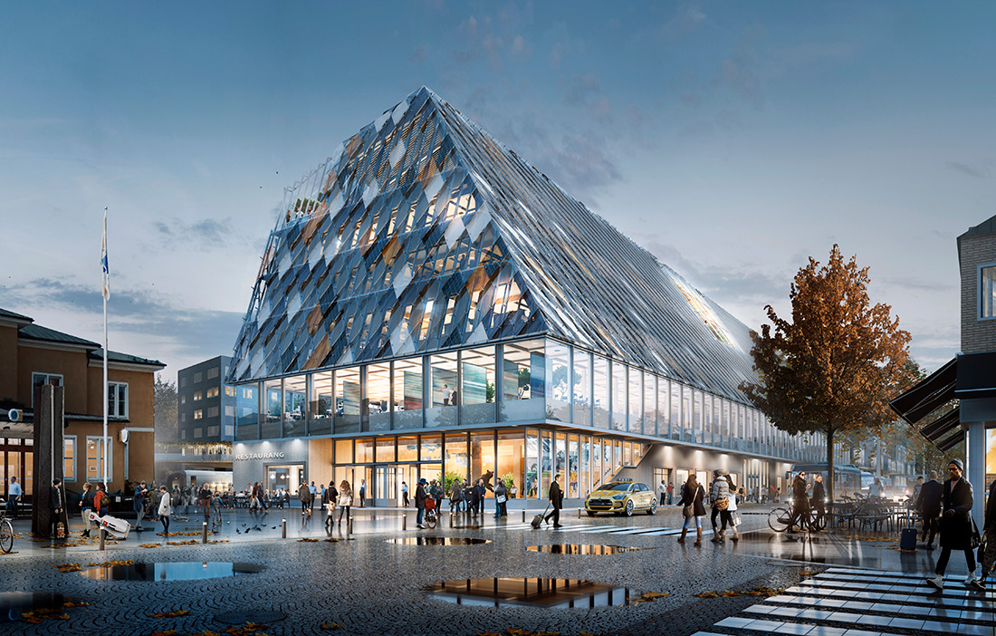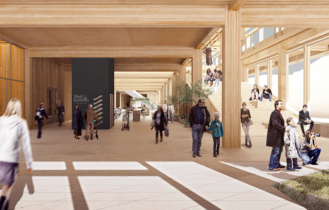 A unanimous jury chose White’s proposal for a new city hall and station building in Växjö, ‘Under one roof’, as the winner. The 14,000 square metre building in wood will change the Växjö skyline. The way the glazed façade slopes inwards from the second floor up gives it a strong character. The large expanses of glass reinforce the sense that this is a wooden building, a vertical space for all.