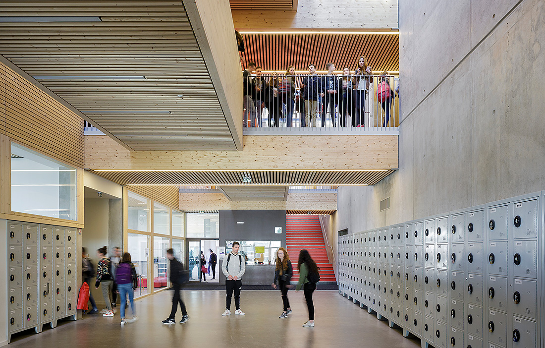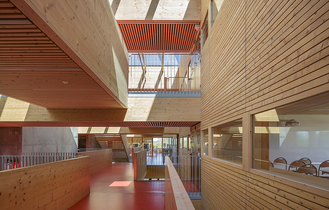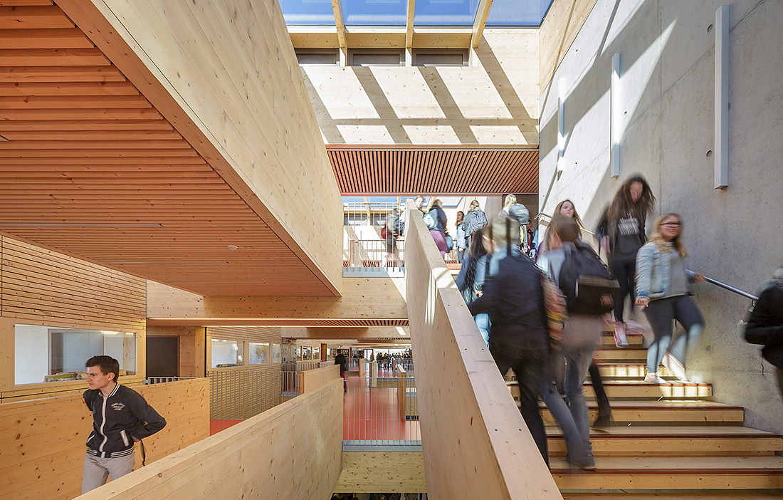 All the wall units were prefabricated and assembled on site in two weeks. Floors two and three house the school’s 16 classrooms, plus nine specialist rooms for chemistry, biology and so on. Both internally and externally, the walls are clad in untreated spruce and Douglas fir. The CLT frame has been left exposed everywhere – floors, ceilings and walls. The bridges and staircases that link the two wings of the building are also made from CLT panels. This ensures that all the levels are connected both functionally and visually.