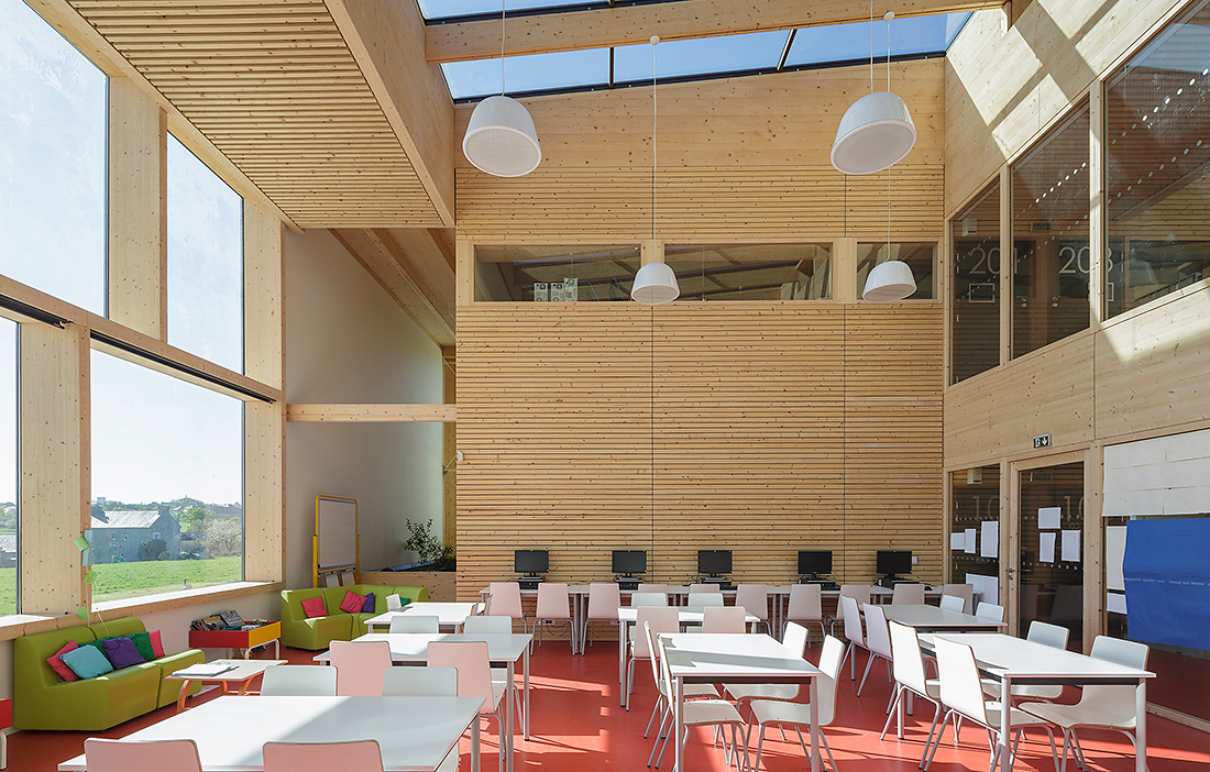 The school was designed by the Austrian architectural practice Dietrich Untertrifaller. When they were commissioned to design the school, they put forward a solution where the whole building was made of wood, but the client was sceptical. The cause of the hesitation was the French laws and regulations on constructing tall buildings in wood. The tradition of building in stone is strong here, not least in Brittany. With the situation as it was, Dietrich Untertrifaller therefore decided to have the ground floor and foundations of the school made from concrete, serving as a kind of reference to the history of the village. One of the ground floor façades was clad in local granite to look like an old stone wall and thus fit in with the local tradition. Once the lower level was in place, the remaining two floors could be built in wood – with the exception of the emergency stairs.