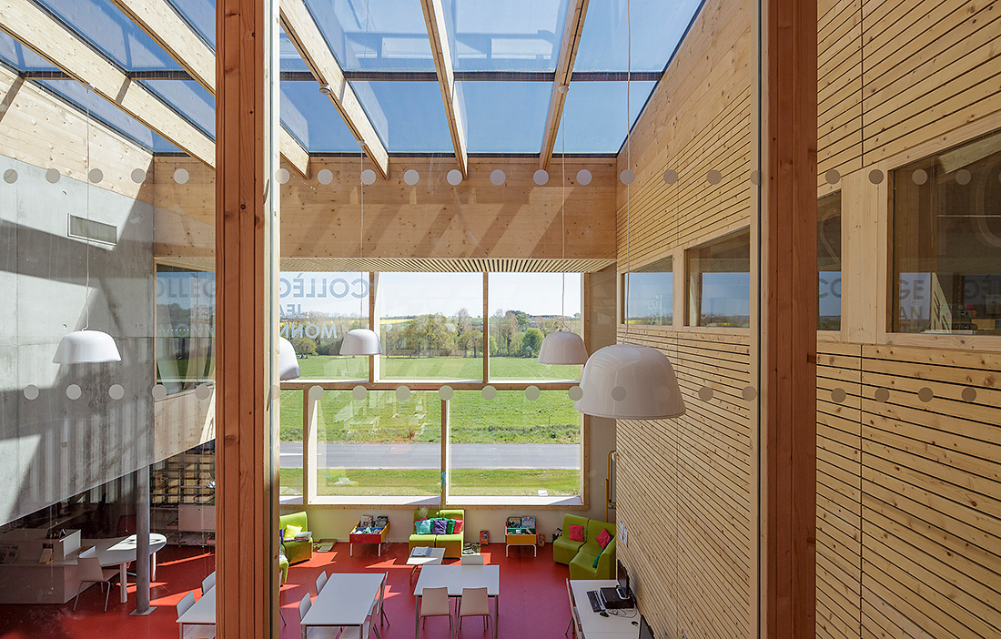 Dietrich Untertrifaller worked on the project with the French practice Colas Durand Architectes. When they won the commission five years ago, they just had one office in Vienna, and the only way to get to the school in Brittany was to fly to Paris, then get a train and then drive the last stretch. They therefore needed a local partner who could oversee construction. Now Dietrich Untertrifaller does a lot of work in France and so has set up an office in Paris. Much Untertrifaller believes in a future with wood. There has been a lot of movement on the restrictions surrounding wooden buildings that they came up against when first planning Jean Monnet. Tall buildings with wooden frames have recently begun popping up here and there across the country, and France has adopted a more central position in Wood Building Europe.