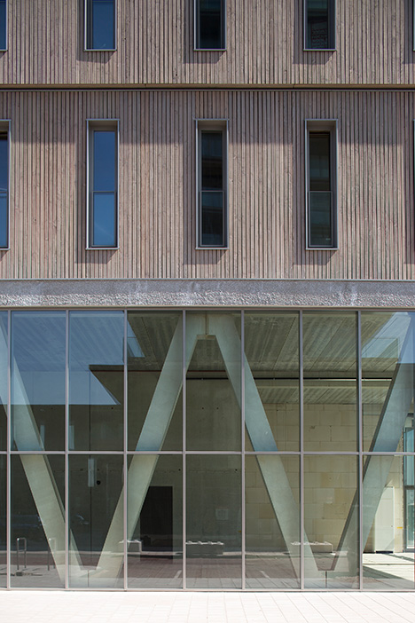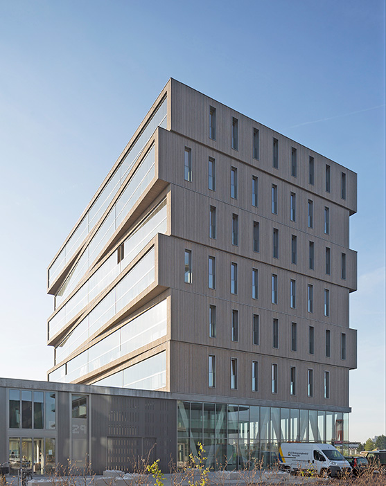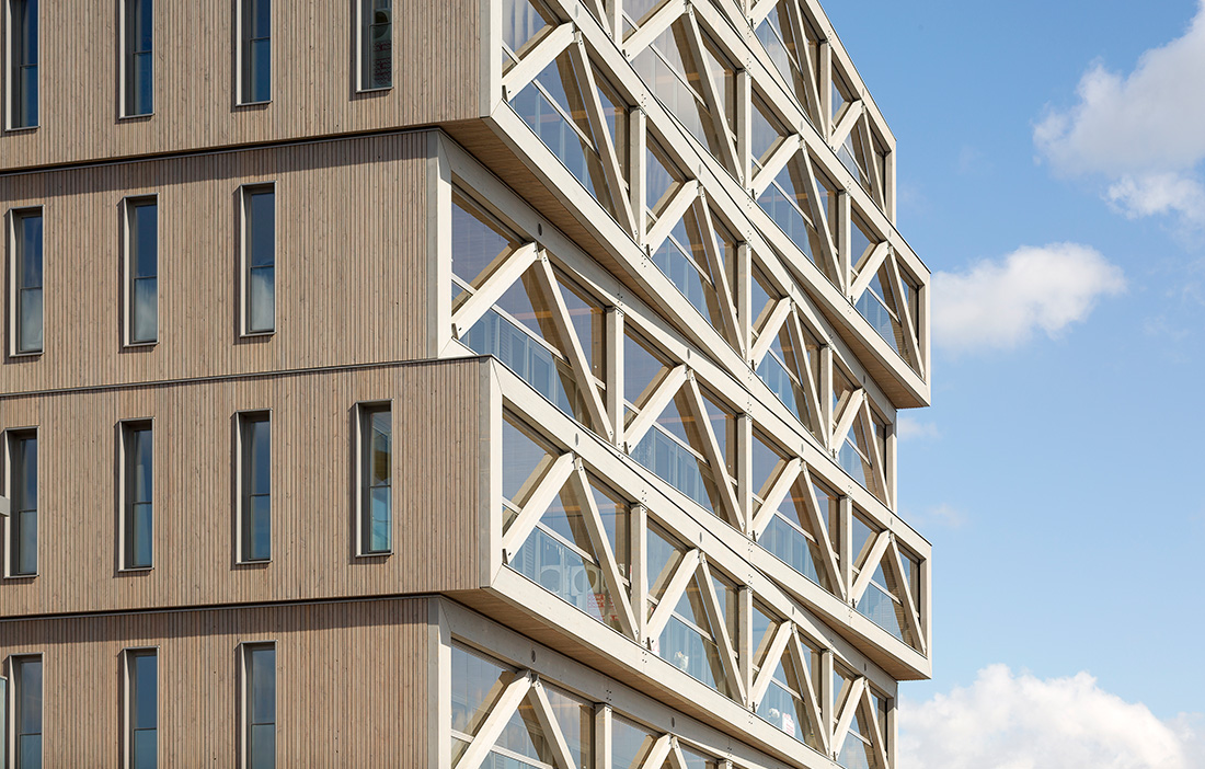 All the wood in the 30 metre high building has been left exposed, including the load-bearing post and beam structure in glulam and the CLT walls. The floor structure is made up of concrete slabs and specially designed steel I-beams to allow for the unusual solution. Dutch building regulations meant that the stairwell and lift shaft had to be made of concrete.