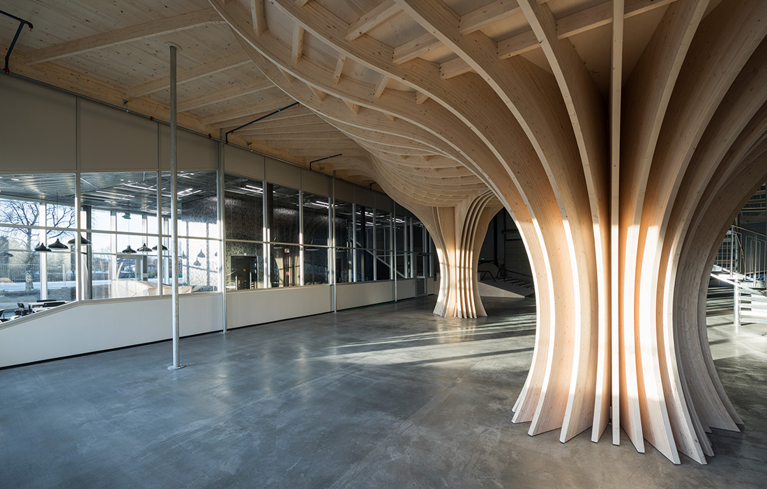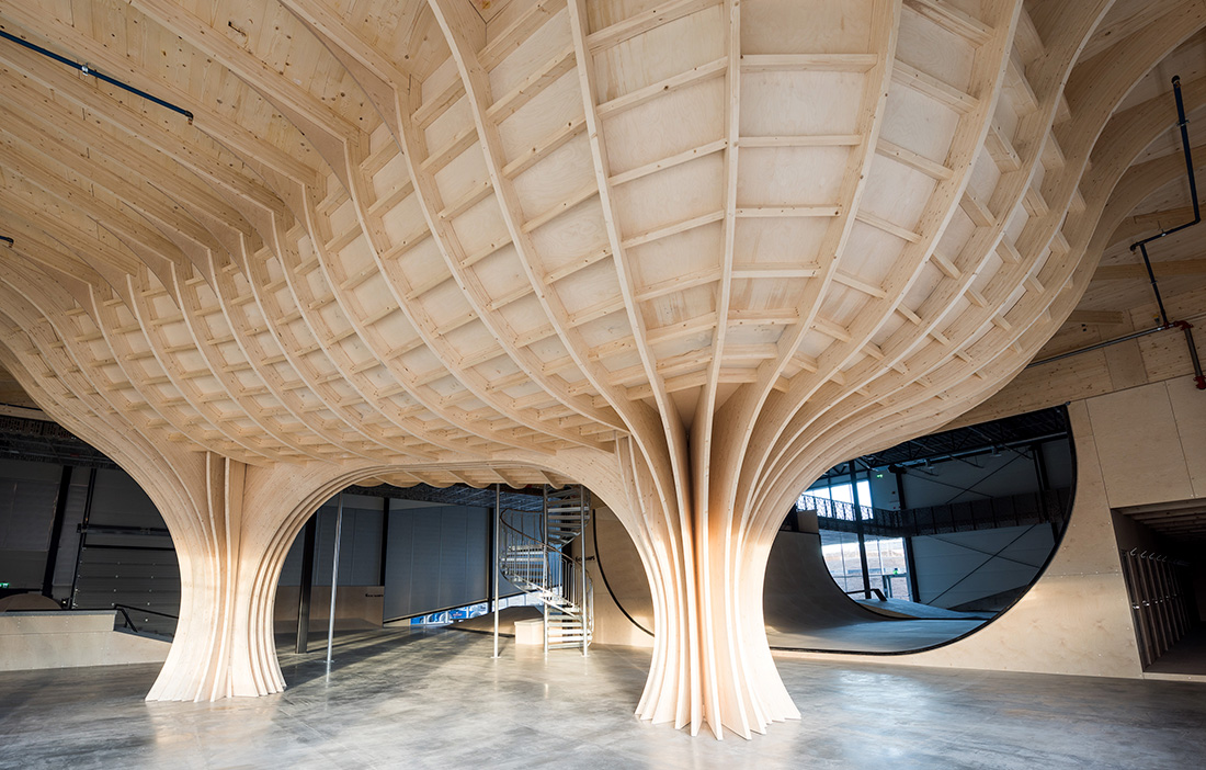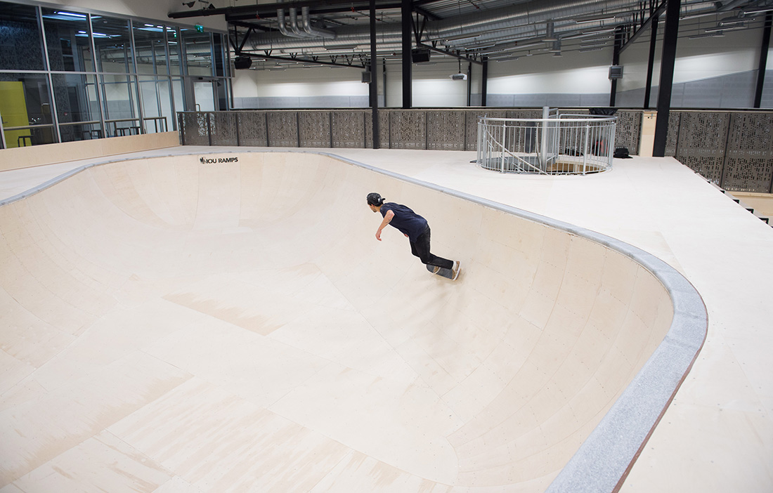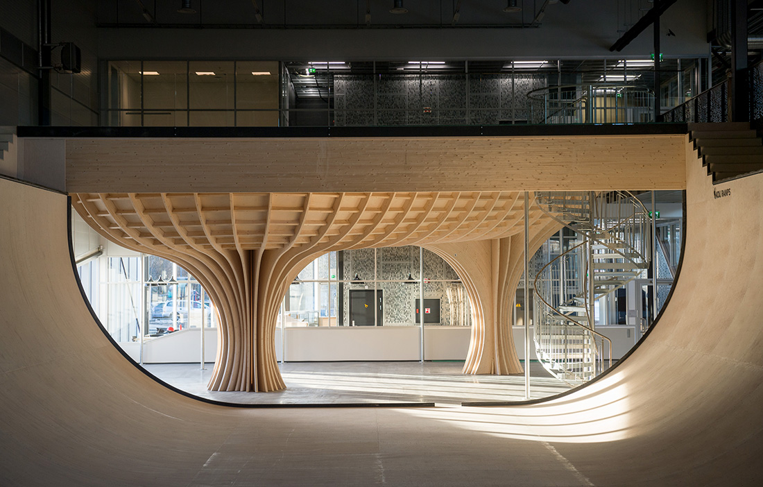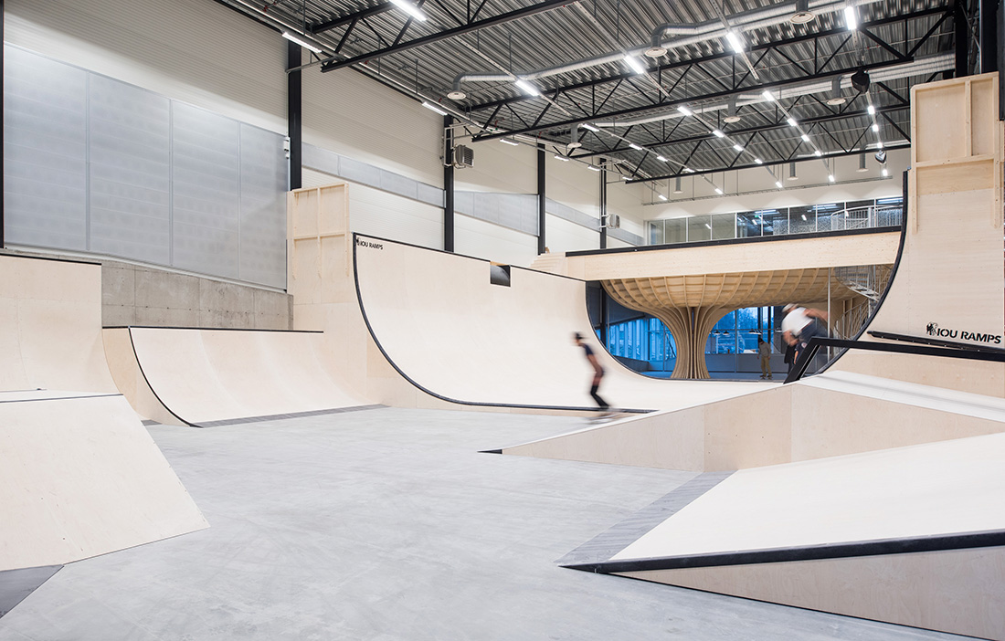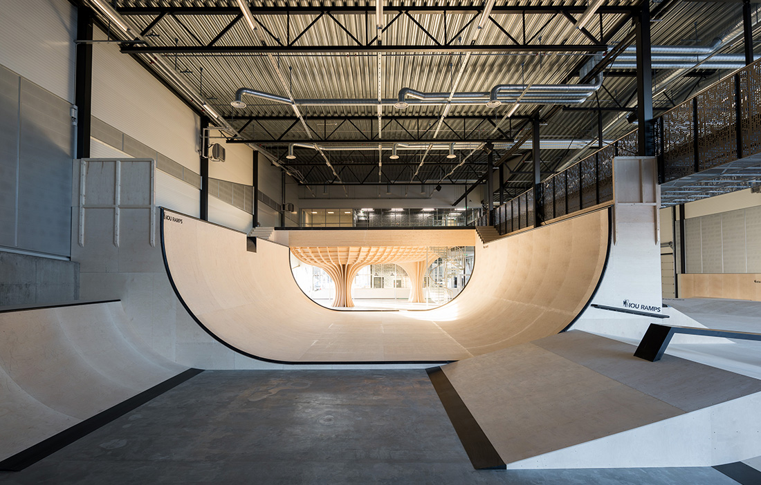 Skateboarders in Oslo have a new place to meet, in a building by Dark Arkitekter. The actual skating facilities were designed by skatepark specialists Glifberg-Lykke, along with ramp manufacturer IOU Ramps. They had the idea that no windows should be obscured by the ramps and bowl (a swimming pool-inspired ramp), so they split parts of the skating area across two floors. The upper edge of the largest ramps and the bowl sit at the same level. As such, instead of being sunk into the floor, the bowl starts from the upper floor of the new building. On the underside of the bowl, the entire glulam structure has been left exposed. The elevated bowl also creates several open surfaces to skate on.