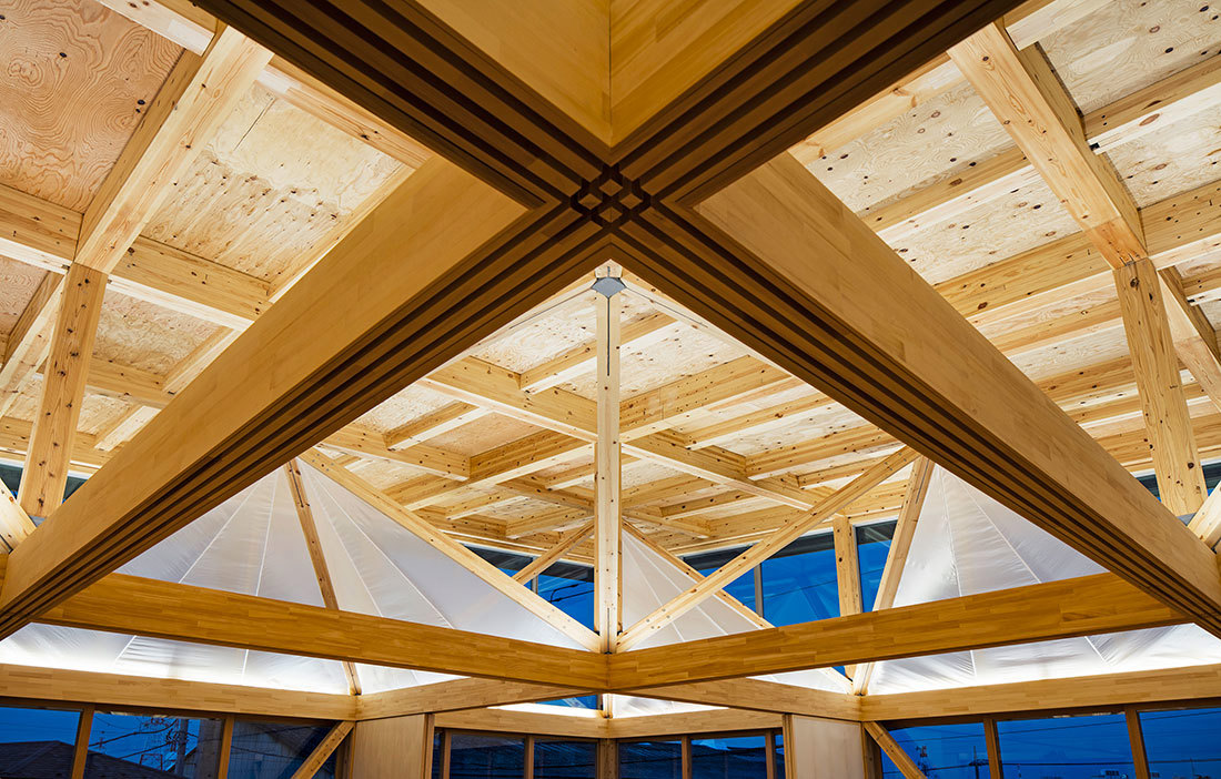 The advanced joinery technology has echoes of traditional Japanese wooden architecture. In practice, the structure can be disassembled and reassembled without any great adverse effect on either the materials or the surroundings.