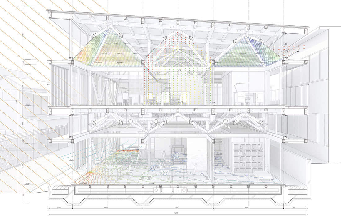 The result was an open wooden structure that helps to soften the relationship between the different types of building. It lends a warmth and natural counterpoint to the surrounding industrial buildings. It was also relatively simple to shape the material to follow the roof’s complex geometry.