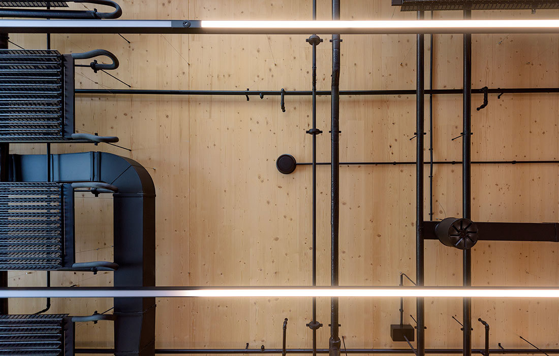 The greatest challenge in the project was achieving the ceiling height that is required on every floor of commercial buildings without exceeding the building’s overall height. This meant that channels would have to be cut out of the glulam beams to accommodate certain technical installations, but this ran counter to building regulations. The solution was a new type of reinforced glulam beam: a kind of hybrid where traditional glulam made from spruce boards is bonded together with two sheets of beech LVL for full strength.