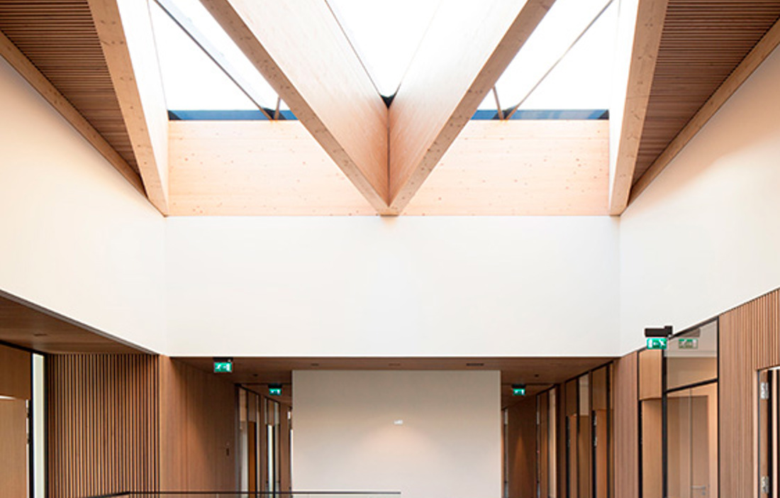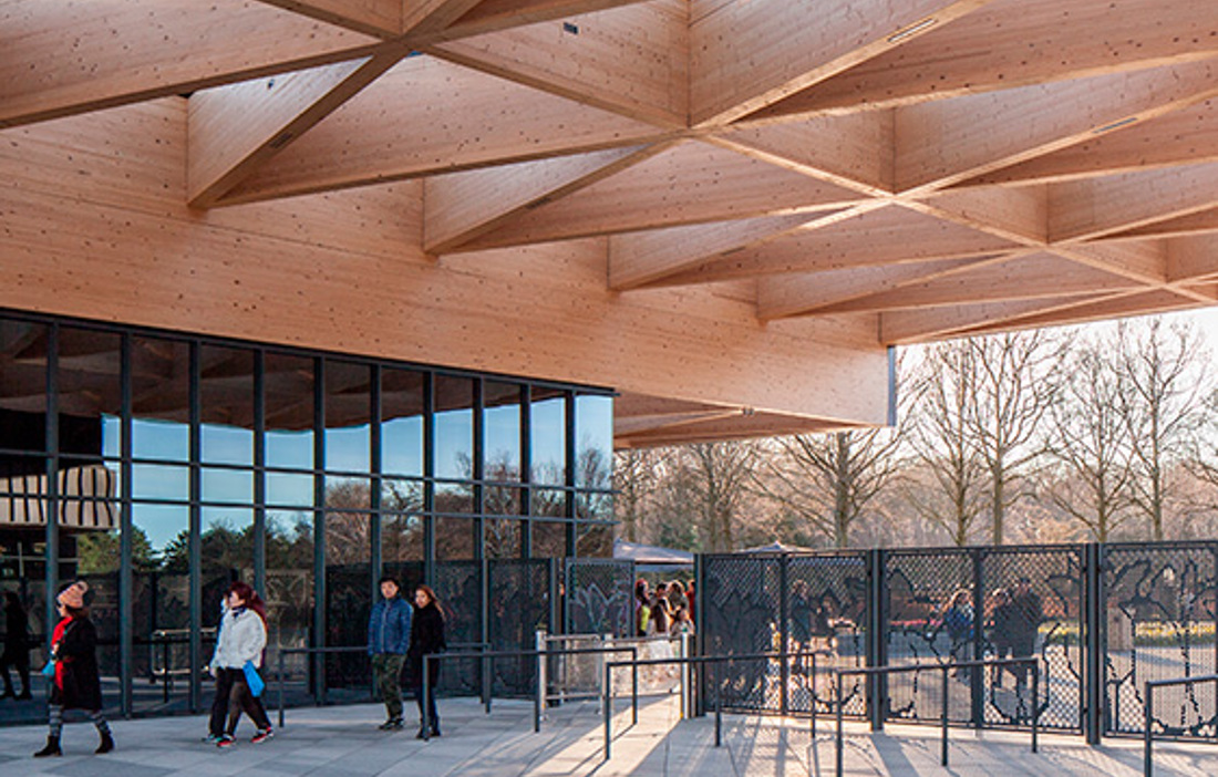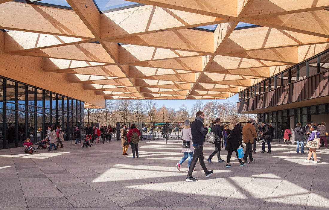 The large glulam beams, arranged in triangles, are clad in copper. Glass covers the openings in the triangles, providing shelter from the elements while also allowing an attractive play of light on the ground. Mecanoo Architecten is the firm behind the 3,200 square metre project, which also includes 1.3 hectares of landscaping.