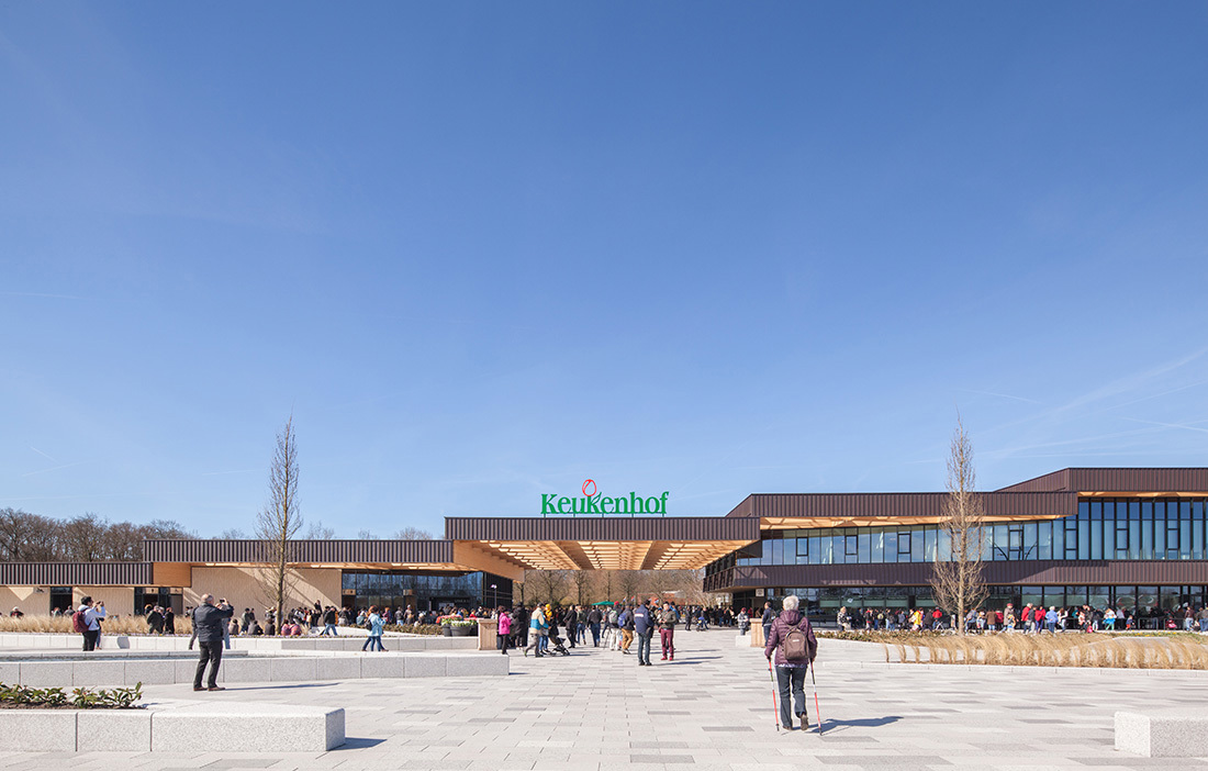 Visitors to Keukenhof’s world-famous gardens are now welcomed by a standout entrance. Interwoven glulam triangles form an impressive roof over two volumes. Like five gigantic steps, the roof climbs upwards to create drama and level changes. The roof envelops and clings to and over the two volumes. One of these looks to have just a single level, but the upper floor is concealed by the roof and draws natural daylight in through lantern lights instead.