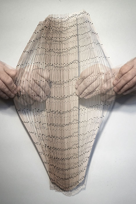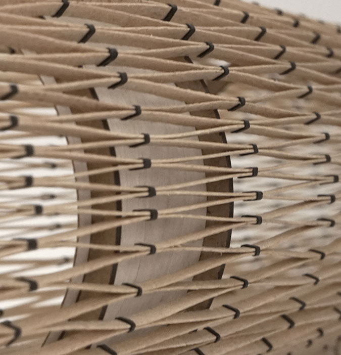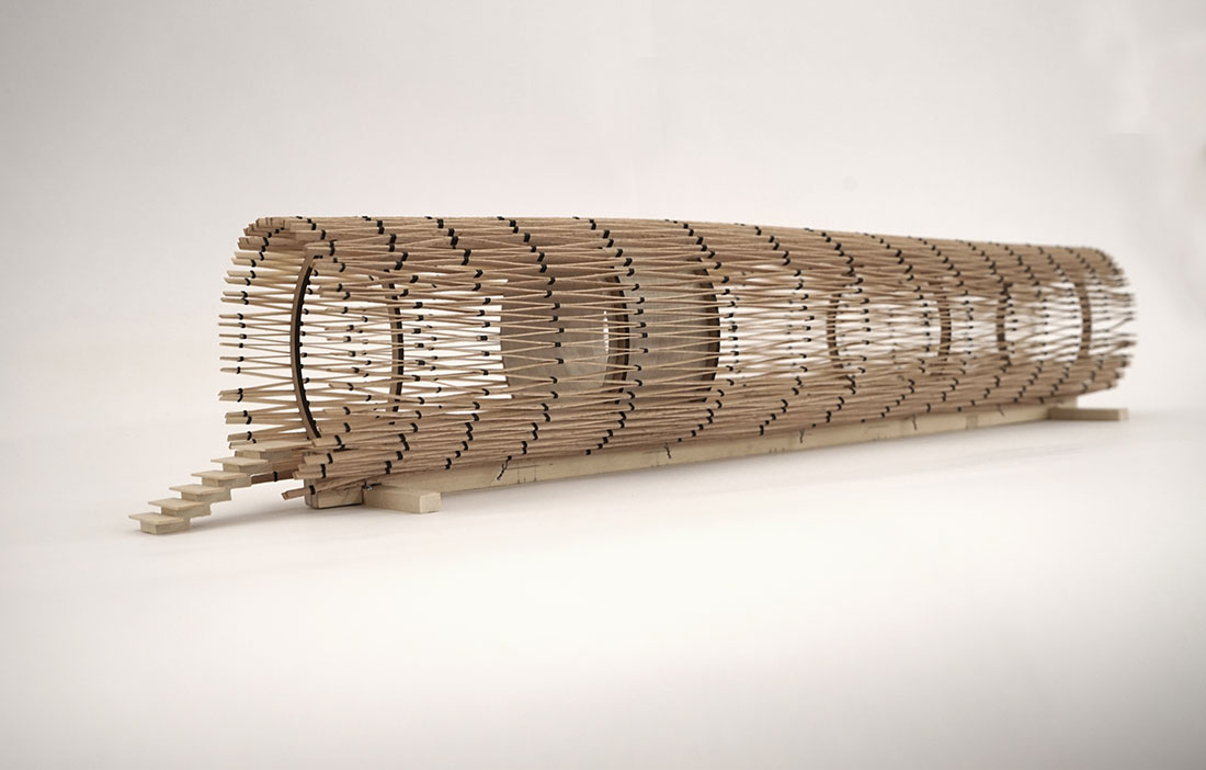 The Swedish architects’ pavilion is meant to explore the elastic properties of wood. Stretching out the wood forms a strong sense of space, almost like a tent, with a thin fabric covering slender arches. In this case, the fabric is made from planed 15x90 mm wooden laths that are alternately joined with cable ties. The framework is then stretched over glulam hoops to create a tunnel. Different effects are created, depending on where the cable ties are positioned and how hard the framework is tensioned. The architects call this an analogue parametric design.