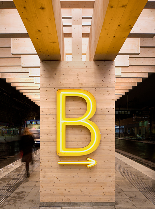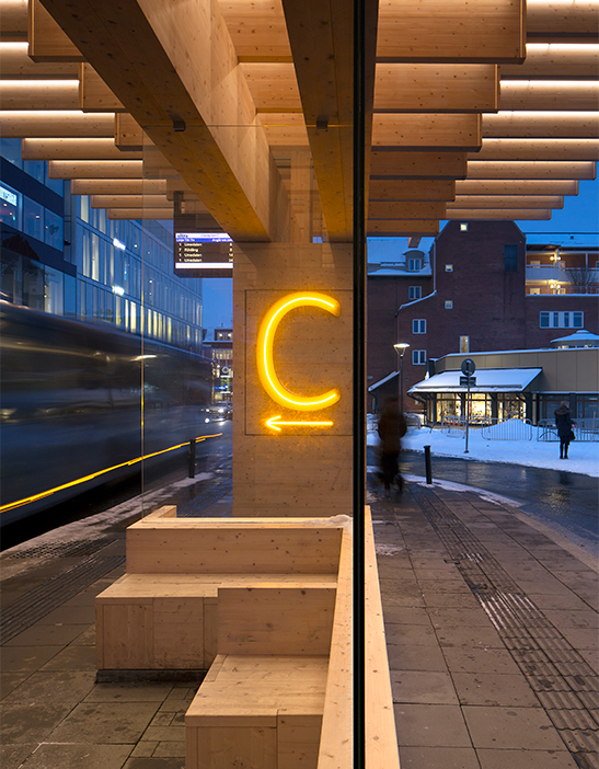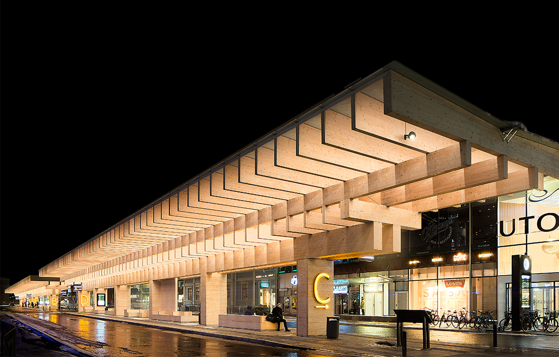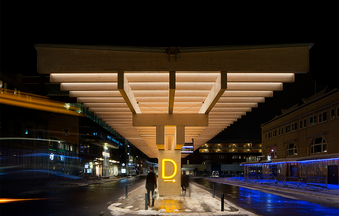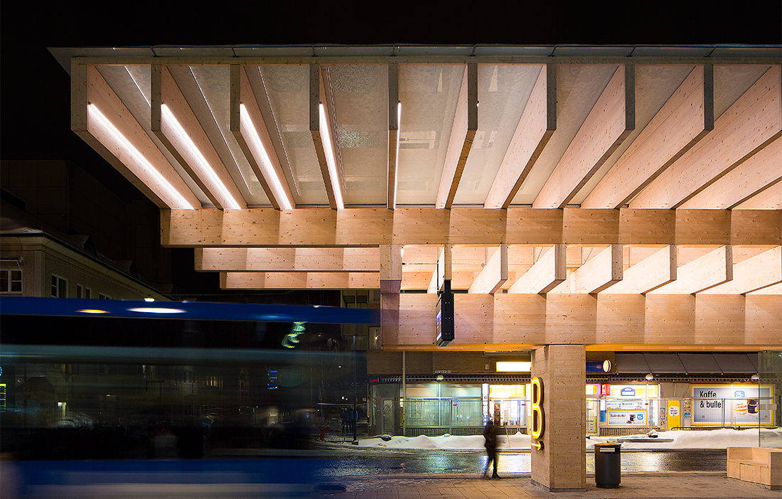 Vasaplan in Umeå is no longer just a hub for buses and a place to pass by on the road. With its new design and glulam features, the square has also become a place where people can come together. The central platform, under two canopies, has a distinct wooden structure, with the supporting glulam beams forming a grid pattern. On sunny days, the wooden members will bring life to the square with an ever-changing play of shadows. However, the glass roof that sits on top of the glulam beams will also provide shelter from the rain.