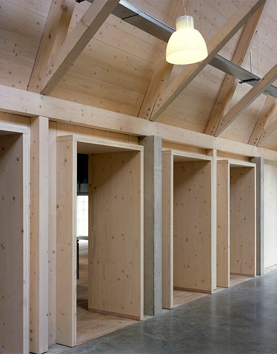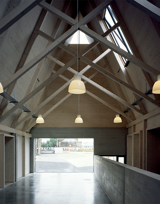 The light that falls on the entrance building’s intricate pattern of scissor trusses creates a striking feature in dialogue with traditional construction techniques. The varied use of wood, in modern panelling, decorative concrete shuttering, laminated sheets or structural timber, both accentuates and bridges the gap between past and present.
