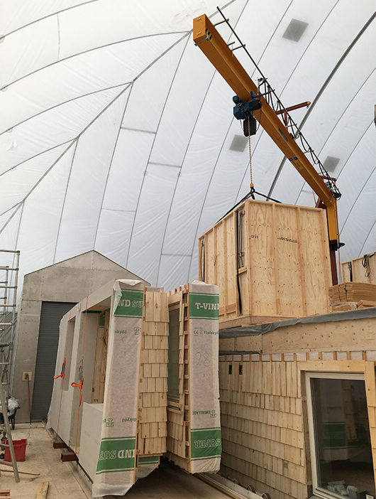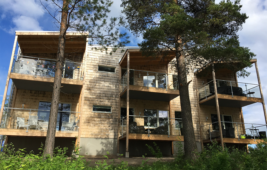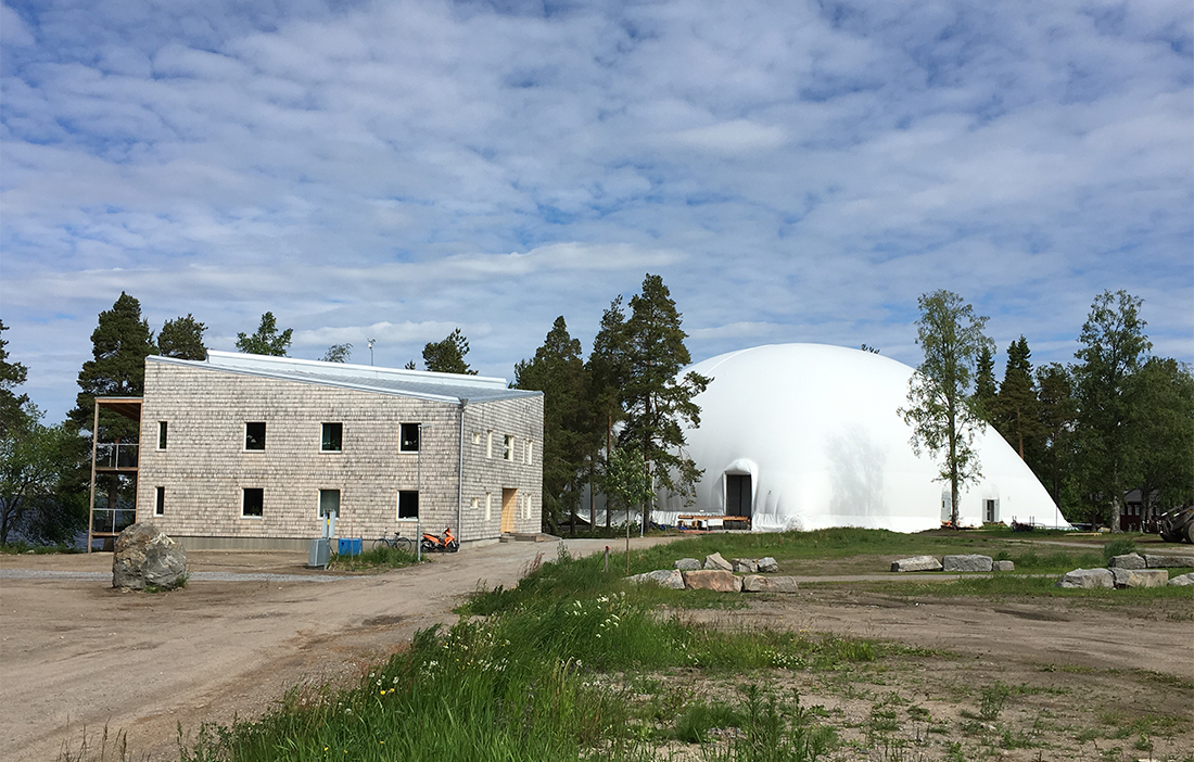 The large domed construction tent was quite a feature in Piteå when the ecological Lusthusbacken development was built. Developed by the contractor Grönbo specifically for the project, the tent saved a great deal of time and created a better working environment. All four floors of the block were built inside the inflatable tent, keeping the entire construction process protected from the elements. The various components were prefabricated in nearby factories and then assembled in the comfort of the tent.