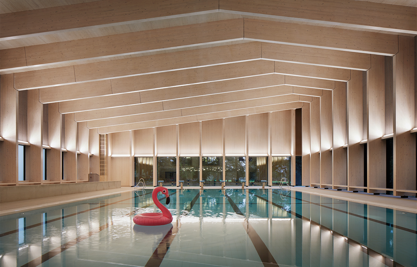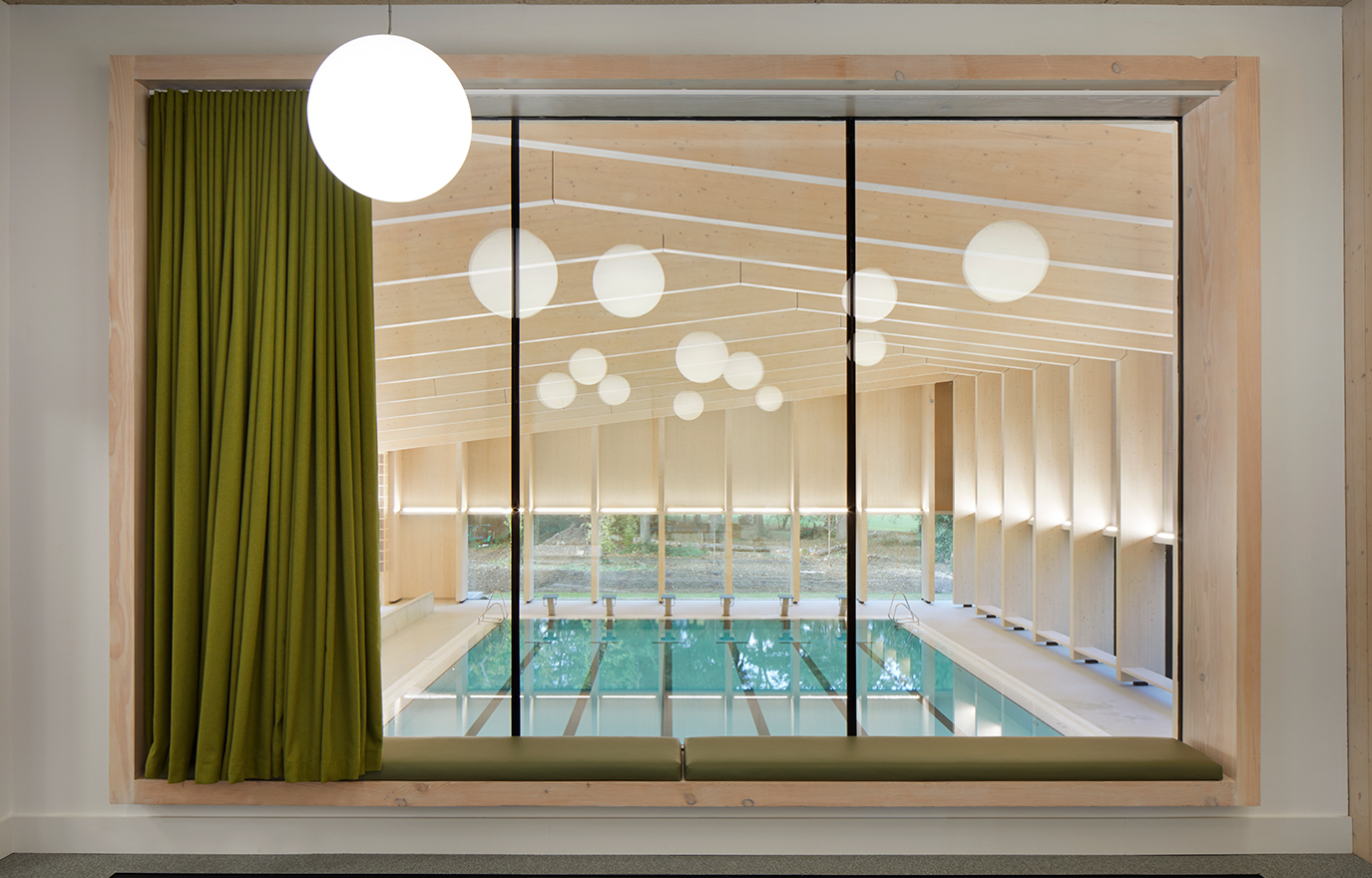 “We wanted to make the most of wood’s warm, comforting properties in the swimming pool. It was one of the reasons why we chose to keep all the wood exposed. It’s also nice for the students who swim here in the day to see the structure. When you see it, you can understand how the building is put together and so it becomes educational and instructive.”
