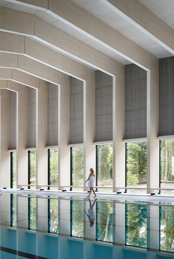 “The surrounding greenery became a major source of inspiration for the pool. We already knew we wanted to build in wood, but that choice ended up being even more obvious. We wanted the woodland to be reflected in the interior, so we created an exposed glulam design. You look straight out into the woods through the large windows, but there’s also wood in the walls and ceiling. It gives a sense of swimming among the trees.”