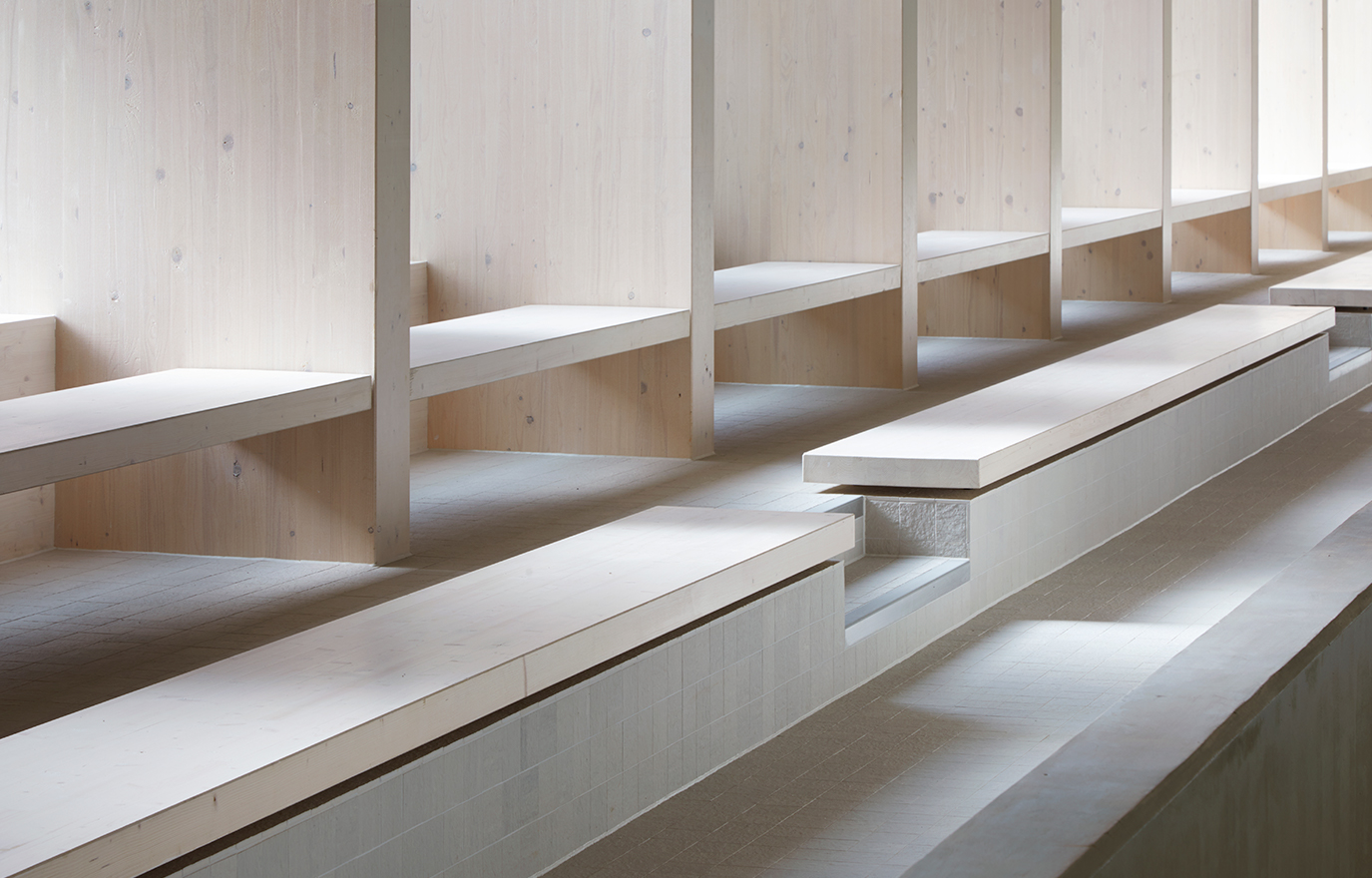 The pool’s structure comprises large portal frames of glulam, with panels of CLT forming the building’s walls and ceiling. Looking up at the vaulted frame, it becomes apparent that some of the beams are jointed and extended. The glulam components are fixed together with dowel joints and inset plates. There is a natural explanation for this approach – the narrow roads in the British countryside made it impossible to transport huge components.