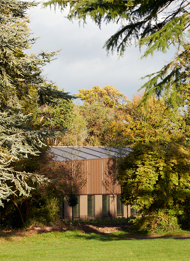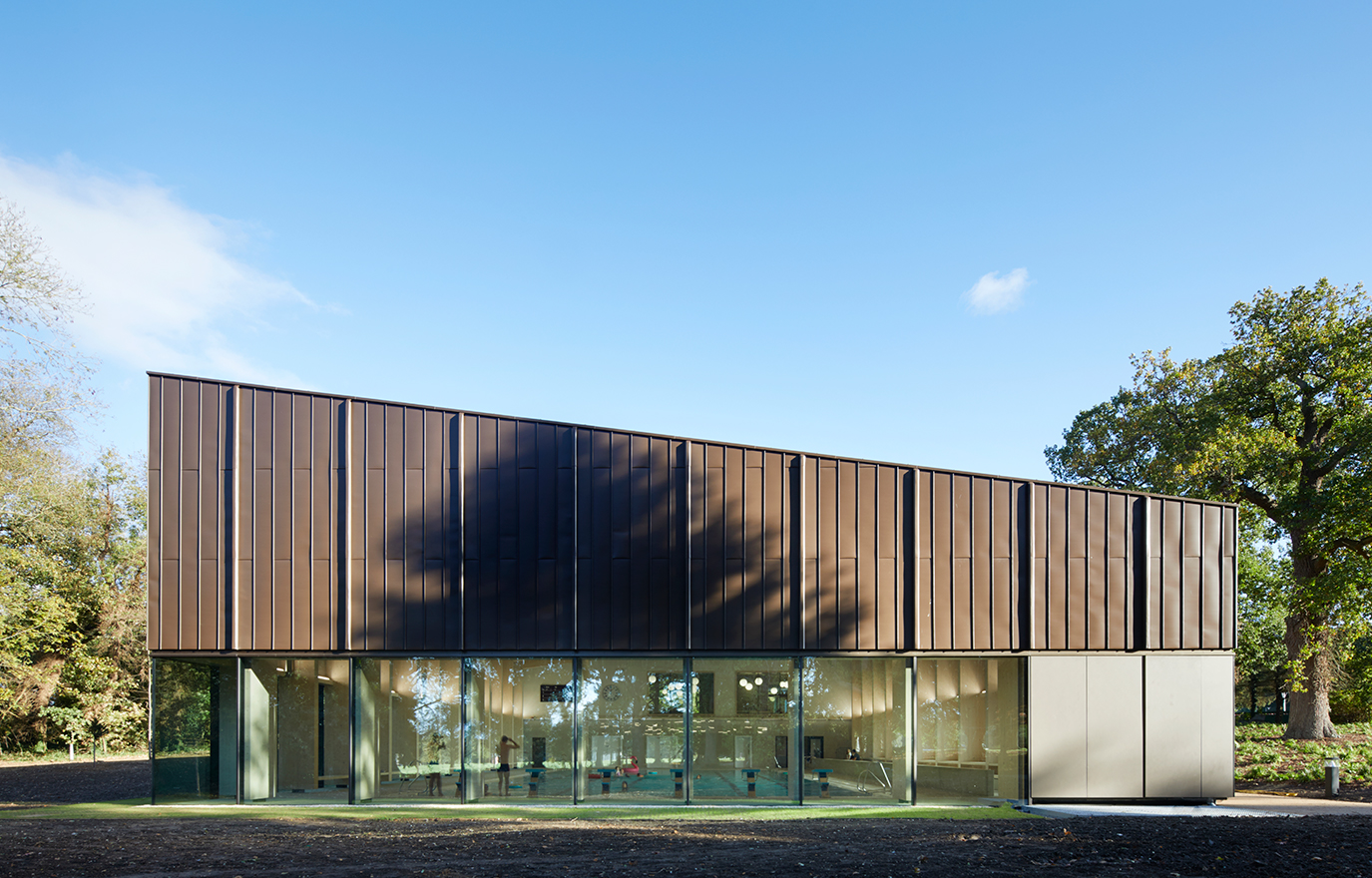 The pool was relocated from the west of the campus to the east, adjacent to the rest of the sports facilities such as the rugby pitch and cricket field, football pitch and indoor tennis courts. Something else nearby that caught the architects’ attention was an area of beautiful old oak woodland. They began to dream about getting to build here, inside the woods. However, that brought major challenges, not least in getting permission to use the land. The landscape, like the school’s stately Main House and other parts of the site, is listed for its historical value. Following long negotiations, the architects eventually obtained permission to build in this location. There was one condition, though – they had to create an attractive building that worked well with the other buildings and accentuated rather than overwhelmed the woodland.