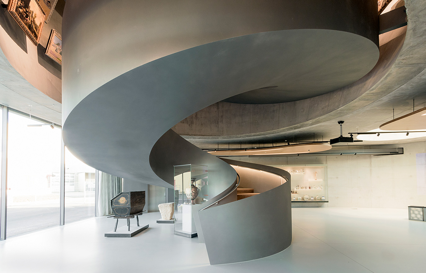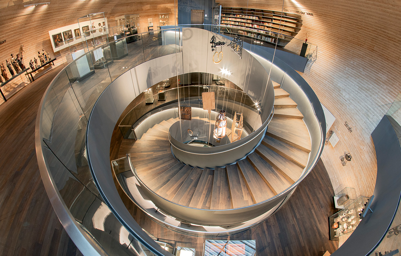 If the outside poses questions, the inside has all the answers, showing how everything hangs together, how the apparently impossible has proven entirely possible. In the interior, the CLT has been left clearly exposed and combined with concrete and glass. The spiral staircase that joins the two floors in the 20 metre high wooden section of the building provides an overview of the exhibition space and contributes to the sense of being in the middle of a tornado. The shape is as striking as the massive collection of objects relating to bread, including a mill from Egypt that is over 1,000 years old. The walls are lined with art showcasing the various ties between humanity and bread.
