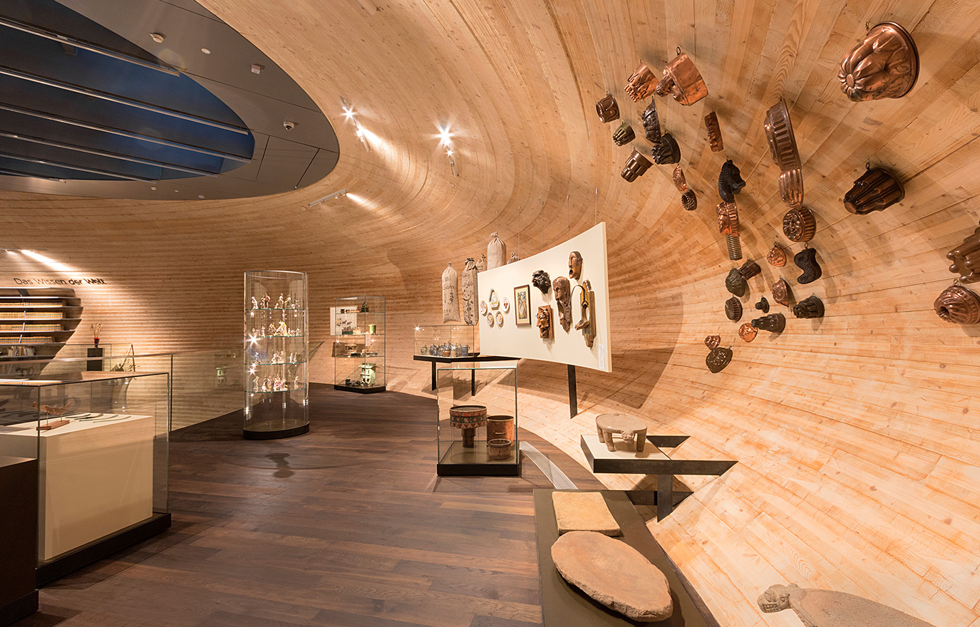 With its 3D-modelled free form, Paneum could be mistaken for a spaceship that has landed near the Austrian city of Linz. As the steel-clad façade sparkles in the light, it is hard to comprehend the level of innovation in wood construction that this building exhibits. It comprises two parts: a boxy concrete volume housing conference facilities and attached to that an exhibition space that accommodates bakery magnate Peter Augendopler’s own, very personal, homage to bread – a museum of its history and its influence on food, culture, art and life. The name Paneum combines pan, which means bread, and eum, which stands for museum. It is therefore only natural that many see the shape as a lump of dough or a loaf.