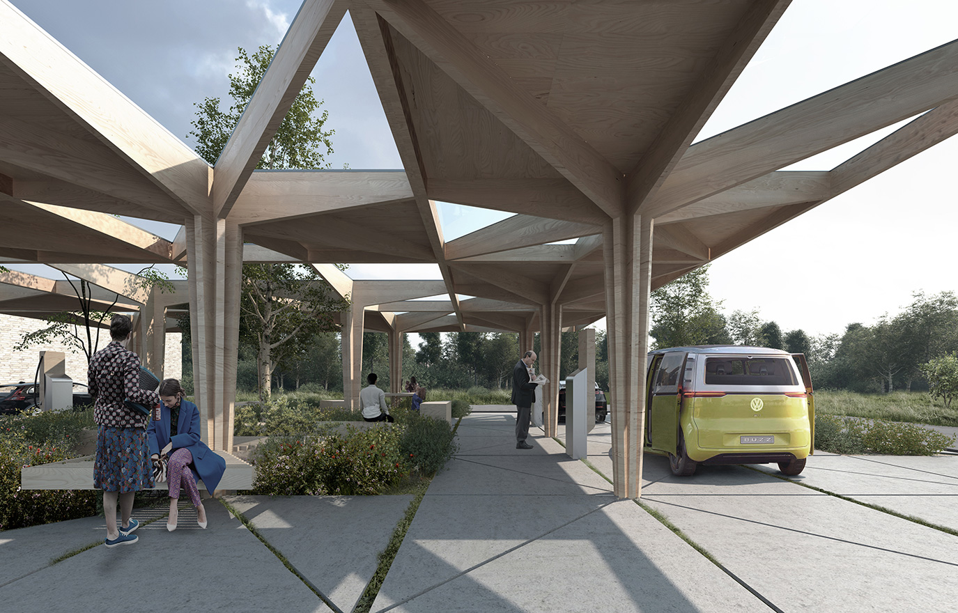 The station is shaped like a stylised series of trees whose canopies create shade and a calm atmosphere. The trees, made from joined glulam half-frames and concrete, are topped with solar panels and have a modular design. A large charging station thus gives the impression of a whole forest. To further enhance the feel, it will also be surrounded by real trees and grass.