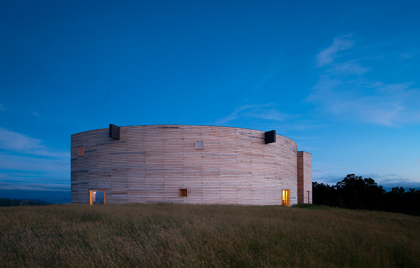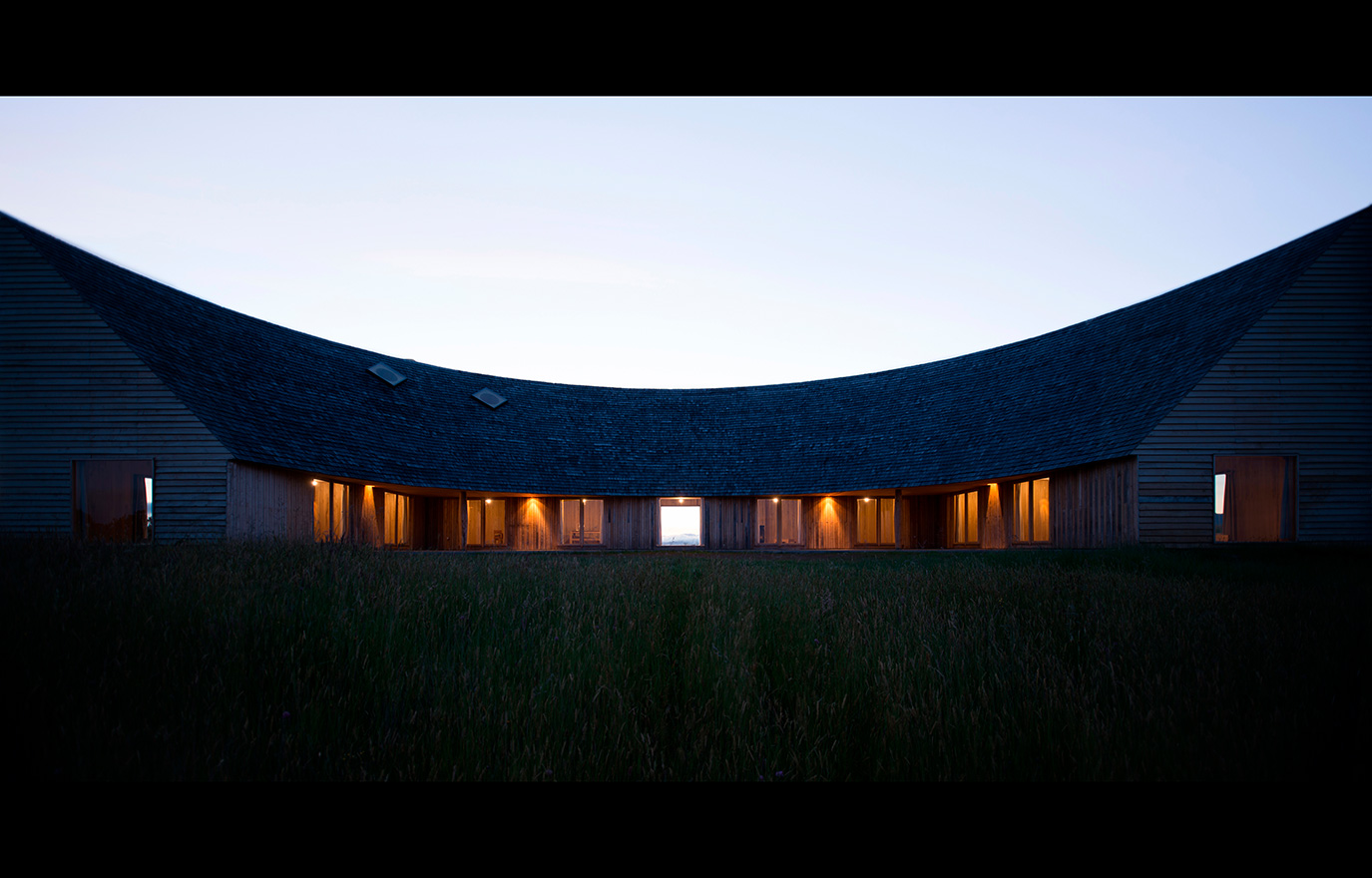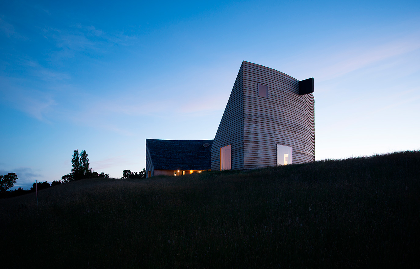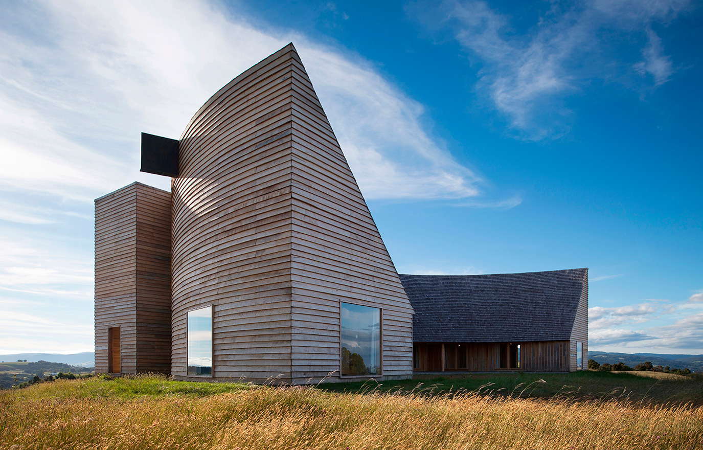 The architects at Pezo von Ellrichshausen have become renowned for their geometric designs, and the house on Chonchi in the Chilean inner archipelago is no exception, with its blend of form and function. They drew inspiration from the old local carpentry traditions that were used to build both boats and churches. The result is a design of two halves. On the one side is a half-moon shaped building with subtle lines and oversized eaves. On the other is an angular design in the form of rectangles and triangles that gives the architecture its playful and striking exterior.