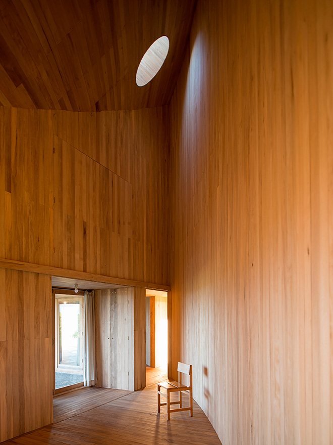 The façades are clad in local timber. Internally, the wood has also been left exposed and, in order to maintain the harmonious feel, the thick walls double up as storage.