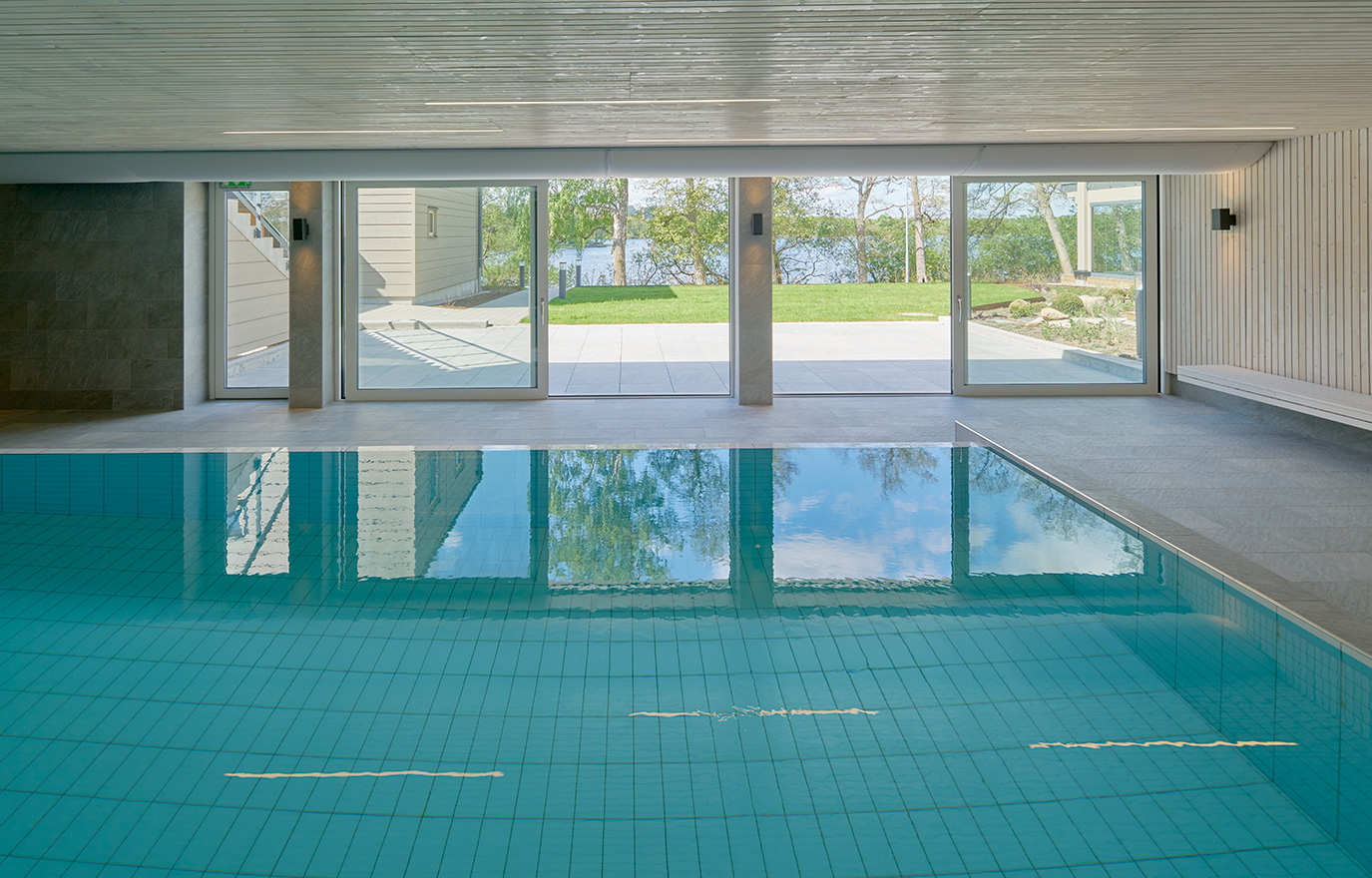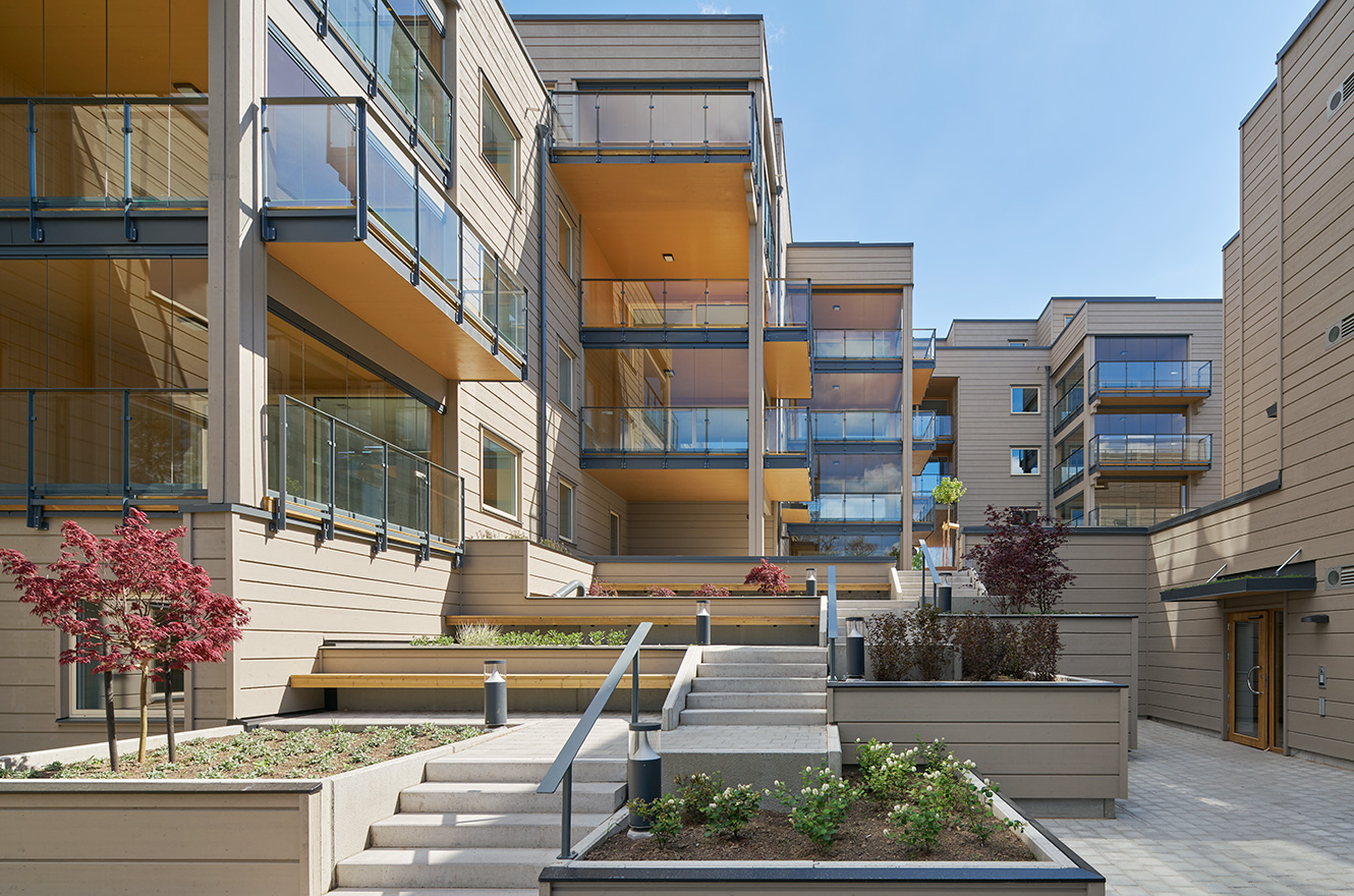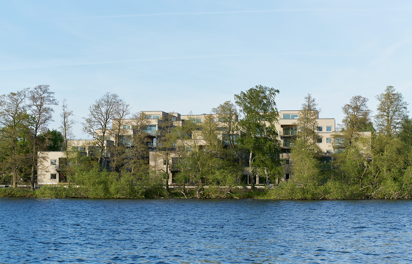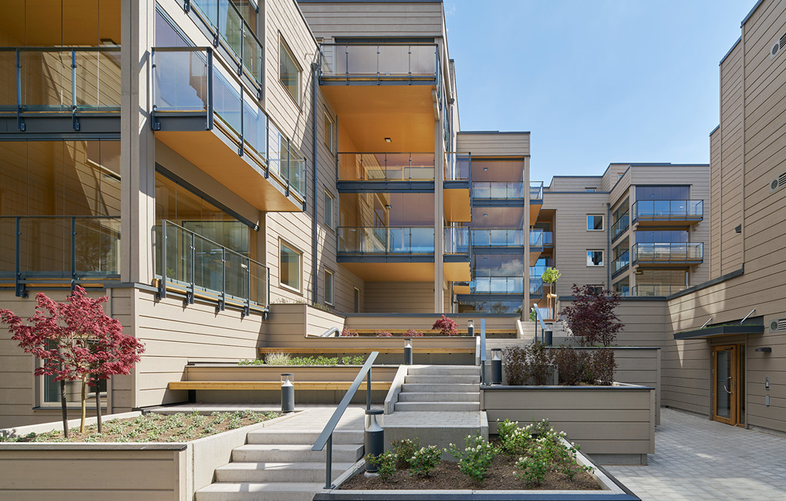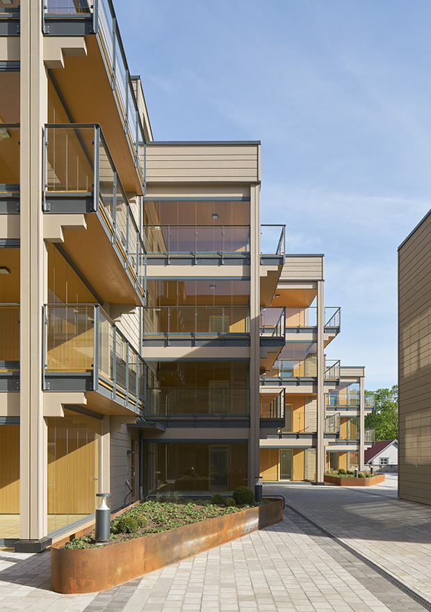 The three volumes house 43 apartments plus communal areas that include a pool, sauna and gym. In addition, there is a shared sun deck with views of Växjö lake that can also be reached by the garden steps that lead down towards the shore. Thanks to the stepped architecture, all the apartments have lake views and their own south-west facing outdoor space. The architects’ ambition was to make the most of the location with its views of two lakes and to adapt the development to the nearby nature, a theme that is immediately apparent outside, where green spaces have been created on the terraced level above the underground garage.
