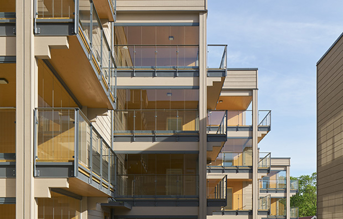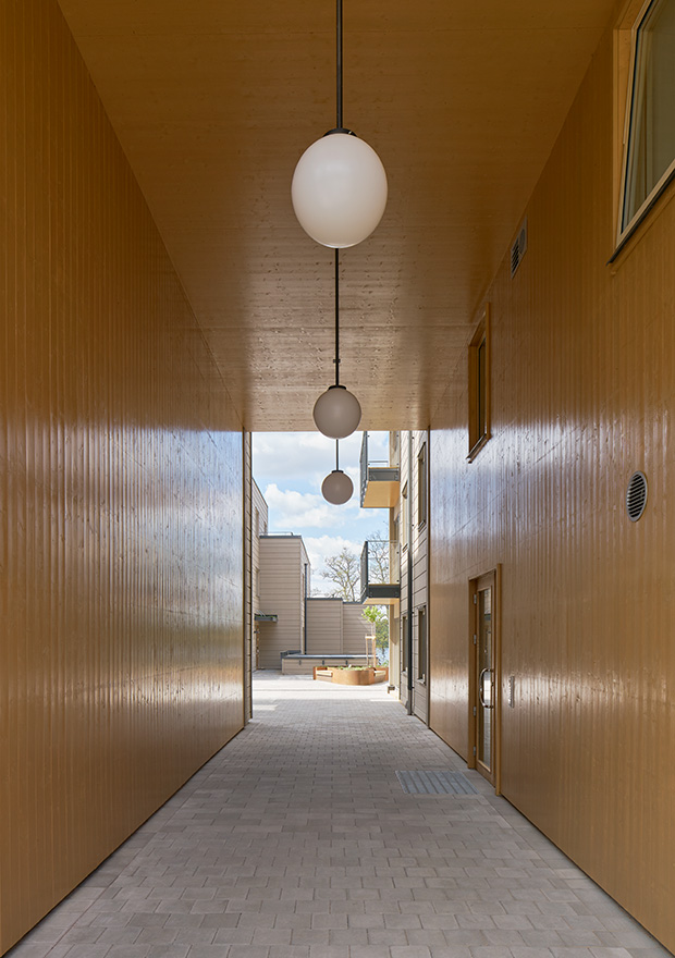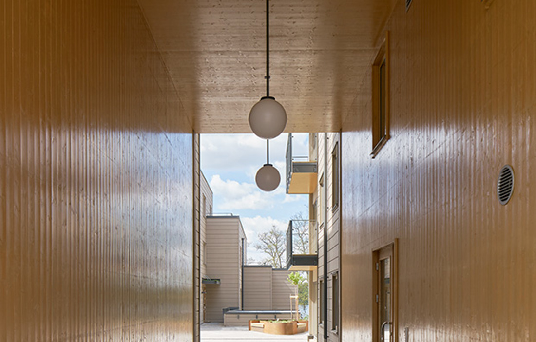 In a city that invests in sustainable building, Arkitektbolaget never doubted that Växjö’s new apartment block would be built in wood. The entire carcass, except the basement, is made from wood. The walls and floors are prefabricated CLT panels and the façades are clad in broad glulam boards. The cladding is placed horizontally and painted in a warm grey.