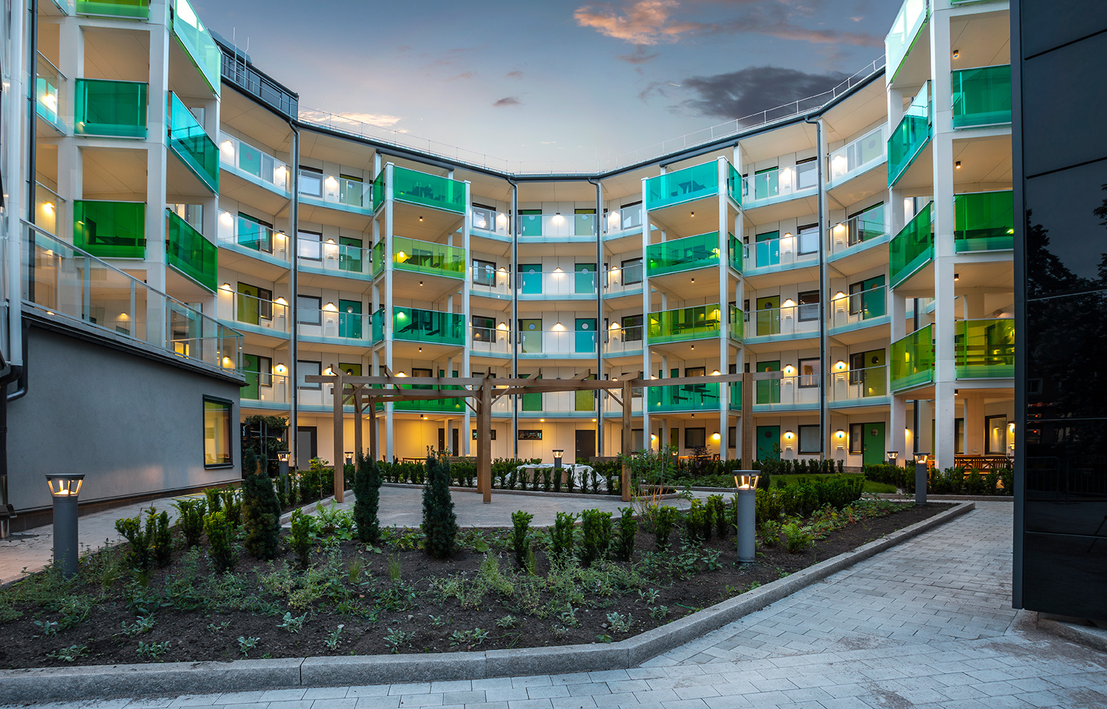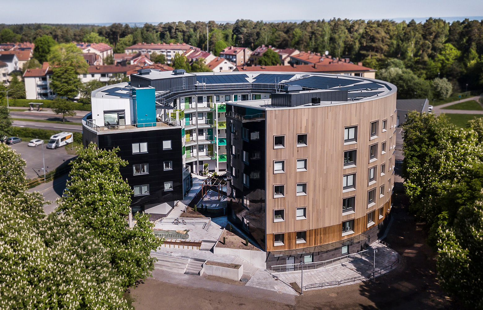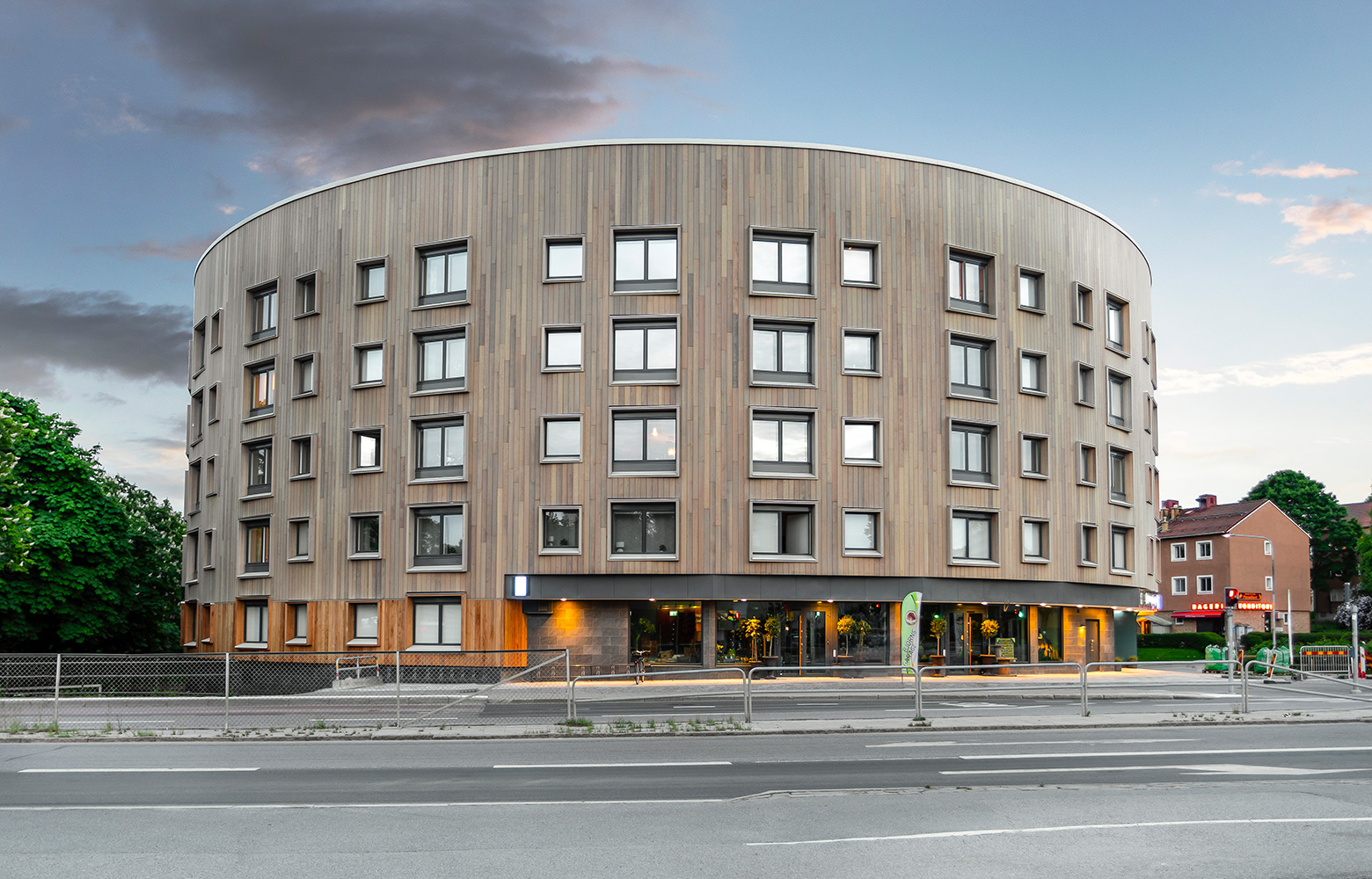 Linköping will soon be gaining its first apartment block made from CLT. Local developer Lindstén Fastigheter is erecting a five-storey building in Vallastaden with 69 rental apartments of varying sizes. At almost twice as many as the original plan for rectangular volumes was going to provide, this figure was made possible because of the almost closed circle design. The ambition behind Valla Berså is to show that apartment blocks can be built in wood, embrace exciting architecture and be sustainable.