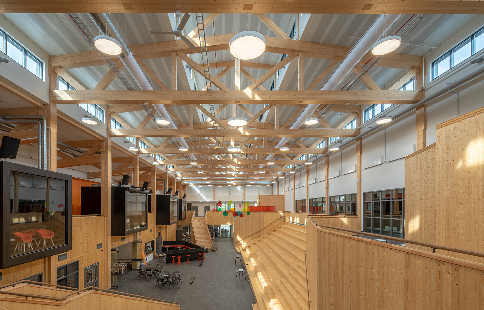Apart from the glazing, all the surfaces in the airy atrium are a combination of glulam and CLT. The glulam roof structure has been left exposed, contributing to the warm, vibrant feel.