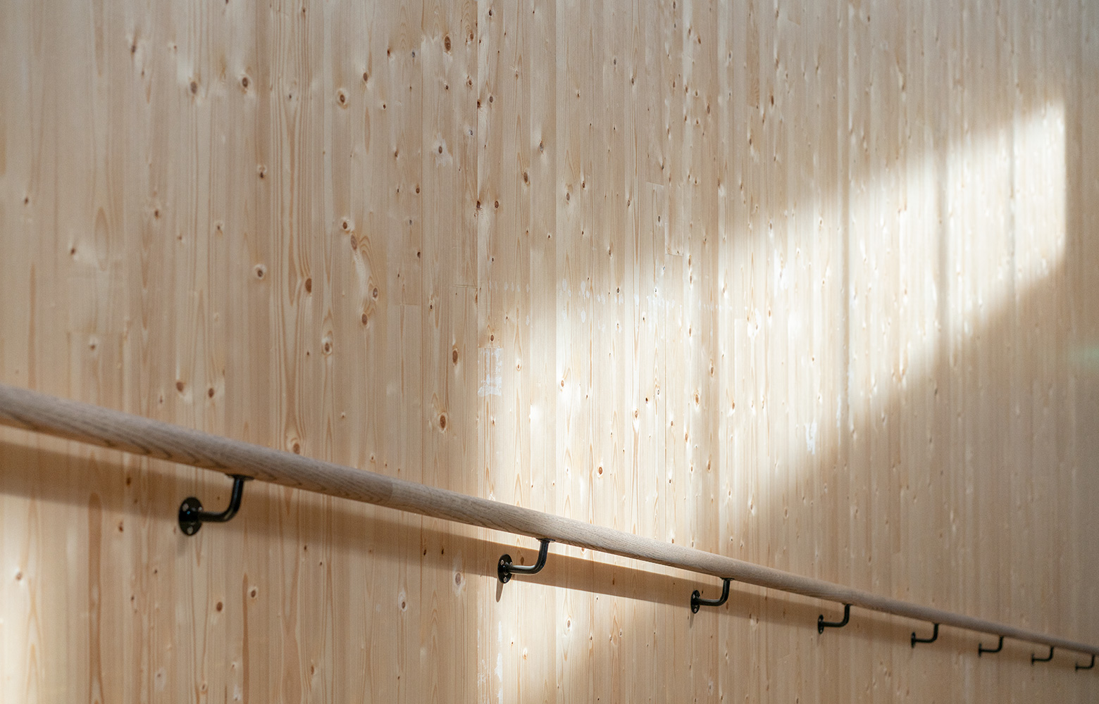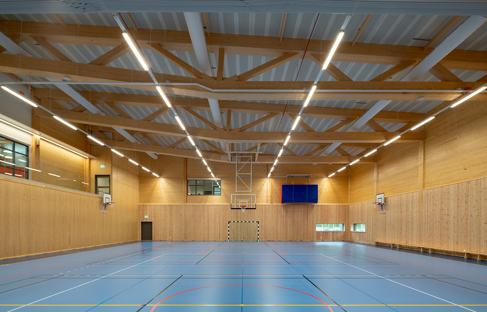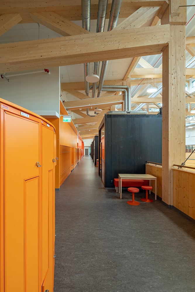 In the atrium and sports hall, both the frame and the surface layer are wood all the way down to the floor. In the classrooms and dining halls, on the other hand, a steel frame supports a first floor with a hollow-core concrete deck. Steel posts were the easiest way to meet the requirement for the frame to be concealed in the walls in these sections. Above that is a glulam frame, with roof trusses coming off most of the uprights. Combining the glulam frame with CLT has also made it possible to create an extra strong structure that can handle the large spans – 26 metres at the widest point.
