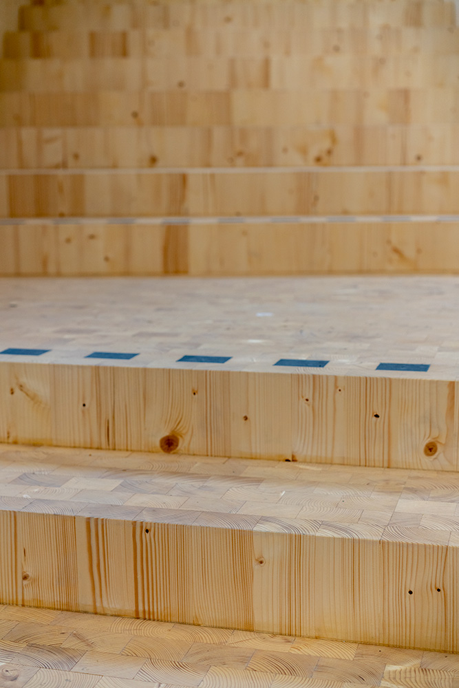 Morö Backeskolan’s relatively modest façade in grey-brown glulam cladding gives very few clues about what awaits inside. While the exterior of the new high school section is designed to blend into the surroundings and form a single unit with the elementary and middle school section from the 1970s, the interior architecture makes a very distinctive statement. Most striking is the 16 metre high and 900 square metre atrium, which serves as both a formal and an informal meeting place, with tiered benches in hard wax oiled glulam where people can sit and chat or listen to a speaker on the stage below. The open area at the bottom has a student café with an eye-catching triangular bar counter made from CLT.
