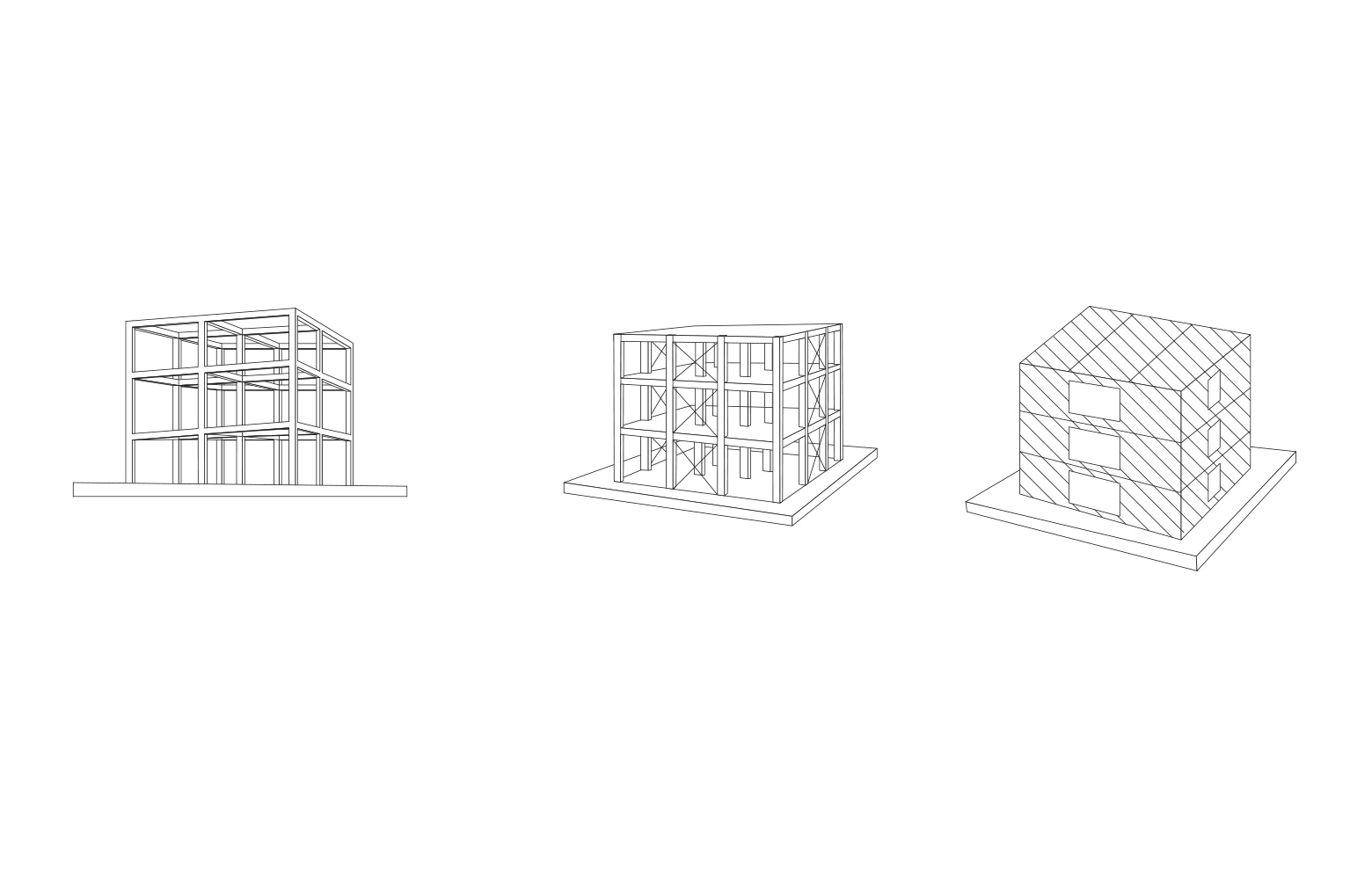 A third stabilisation method is to make use of the diaphragm action, whereby stability is achieved by the load-bearing parts of the frame – walls, floors and ceilings – taking up the lateral forces along their plane. In multi-storey buildings made entirely from wood, CLT is the most common sheet material. With hybrid solutions, a post-and-beam frame in wood can be combined with stabilising concrete slabs to good effect.