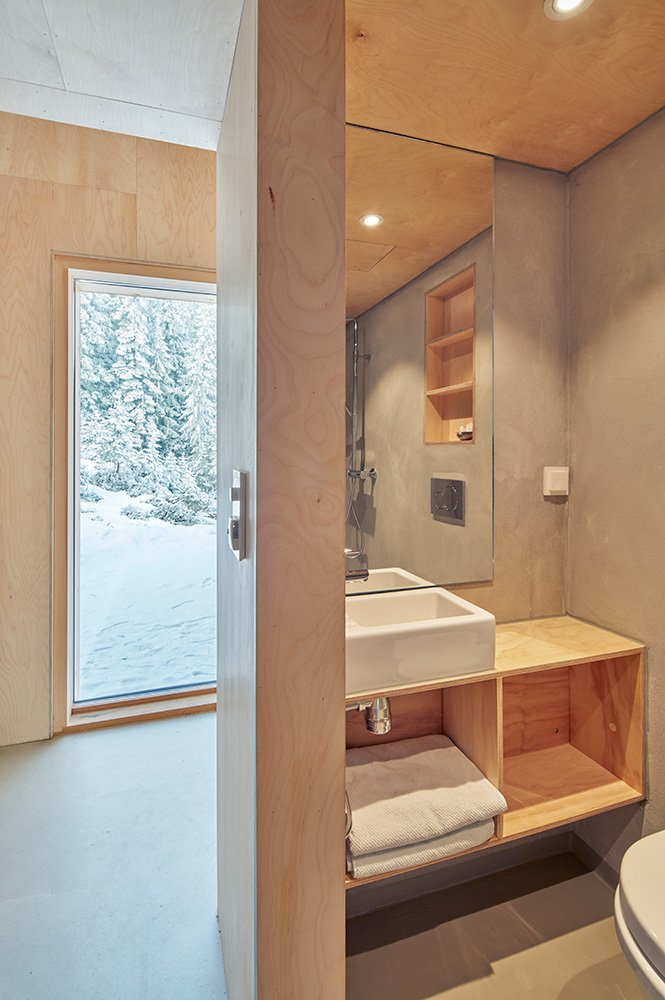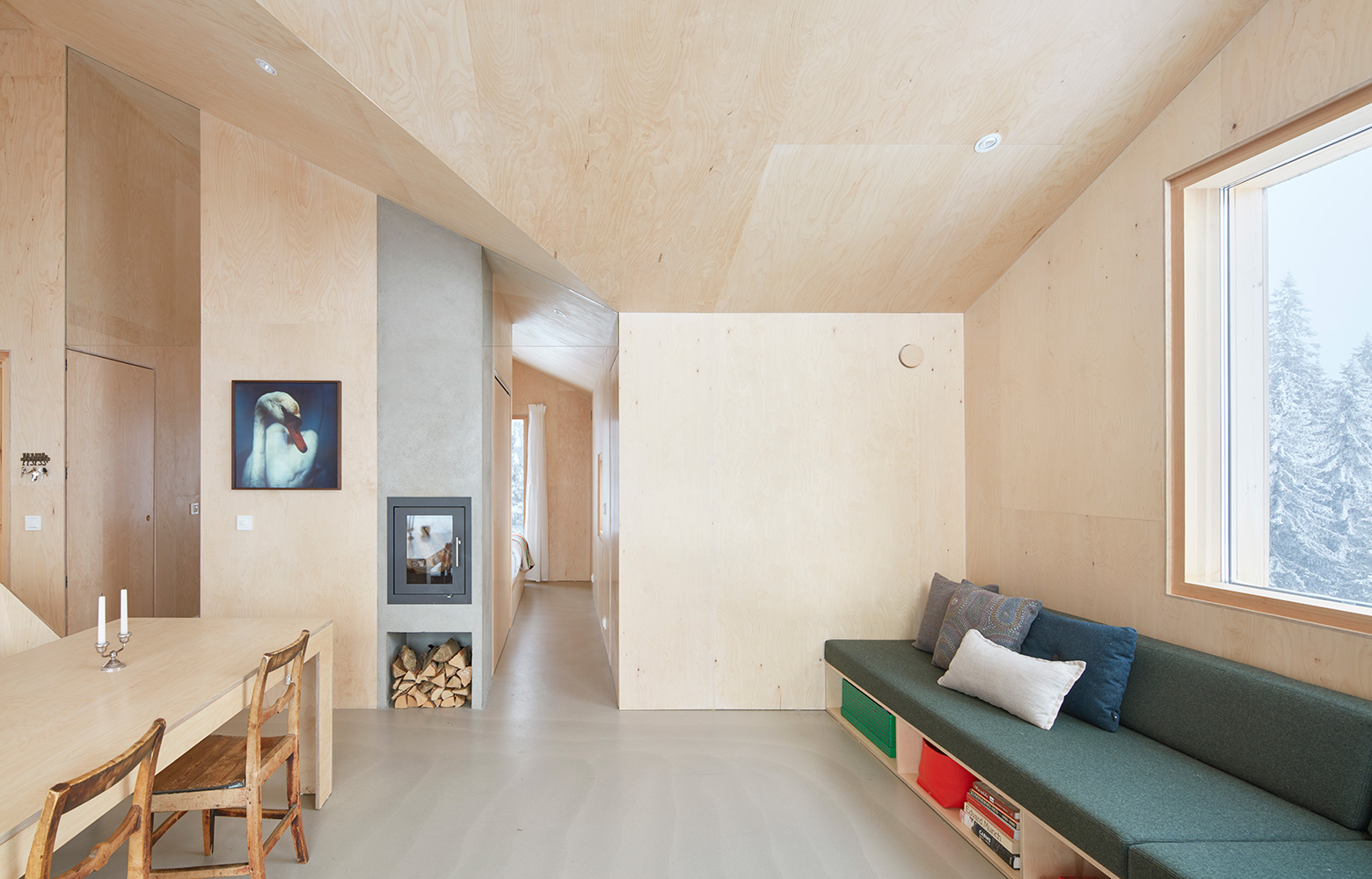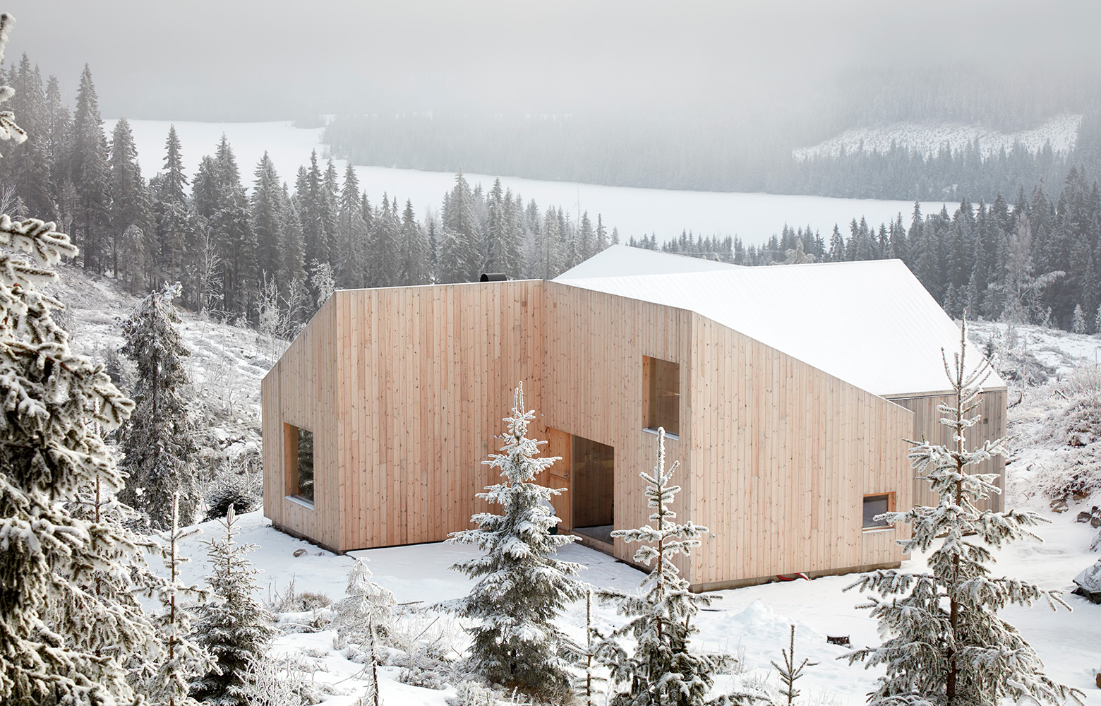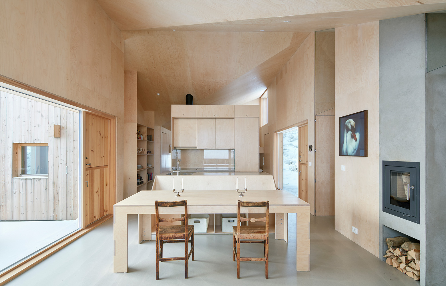 The result was a simple building that takes the cabin idea and gives it a little twist. Instead of creating a rectangular building, the architects chose to start with a central core, off which four volumes emanate like the petals on a flower, in a multiform shape that gives two terraces facing different aspects. As a result of the design, the gable roof recommended on the detailed plan had to be replaced with a monopitch roof. The façade is clad in untreated heartwood pine which the Norwegian weather will turn to a windswept shade of grey over time. Pine is also a distinct feature in most of the interior, with both the walls and the ceilings clad in white-oiled pine plywood.
