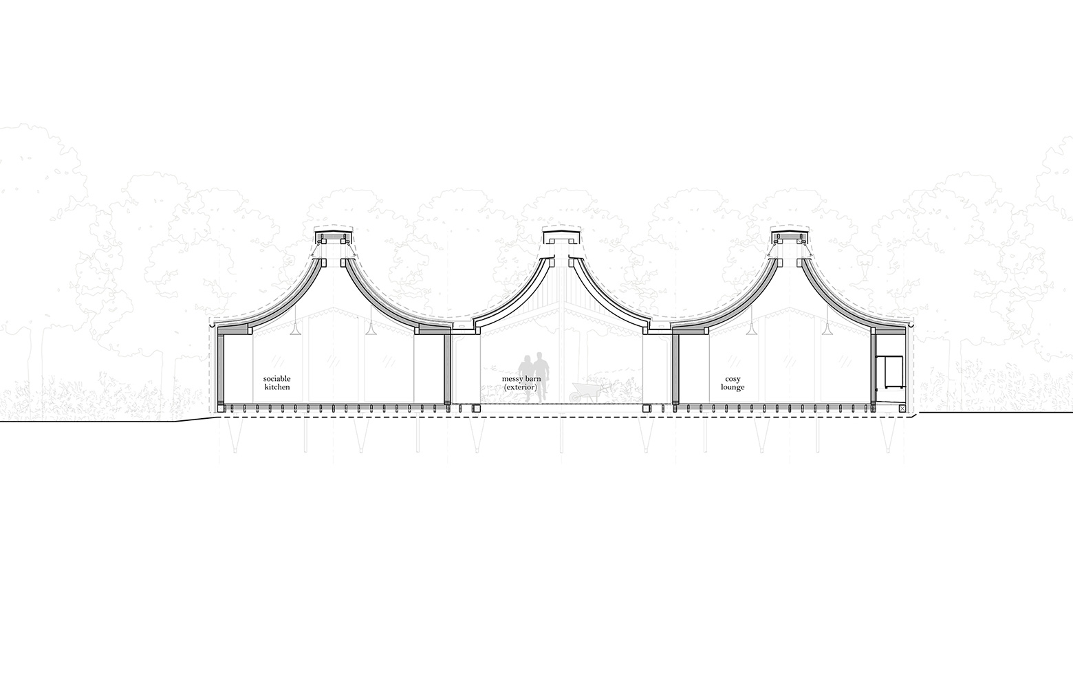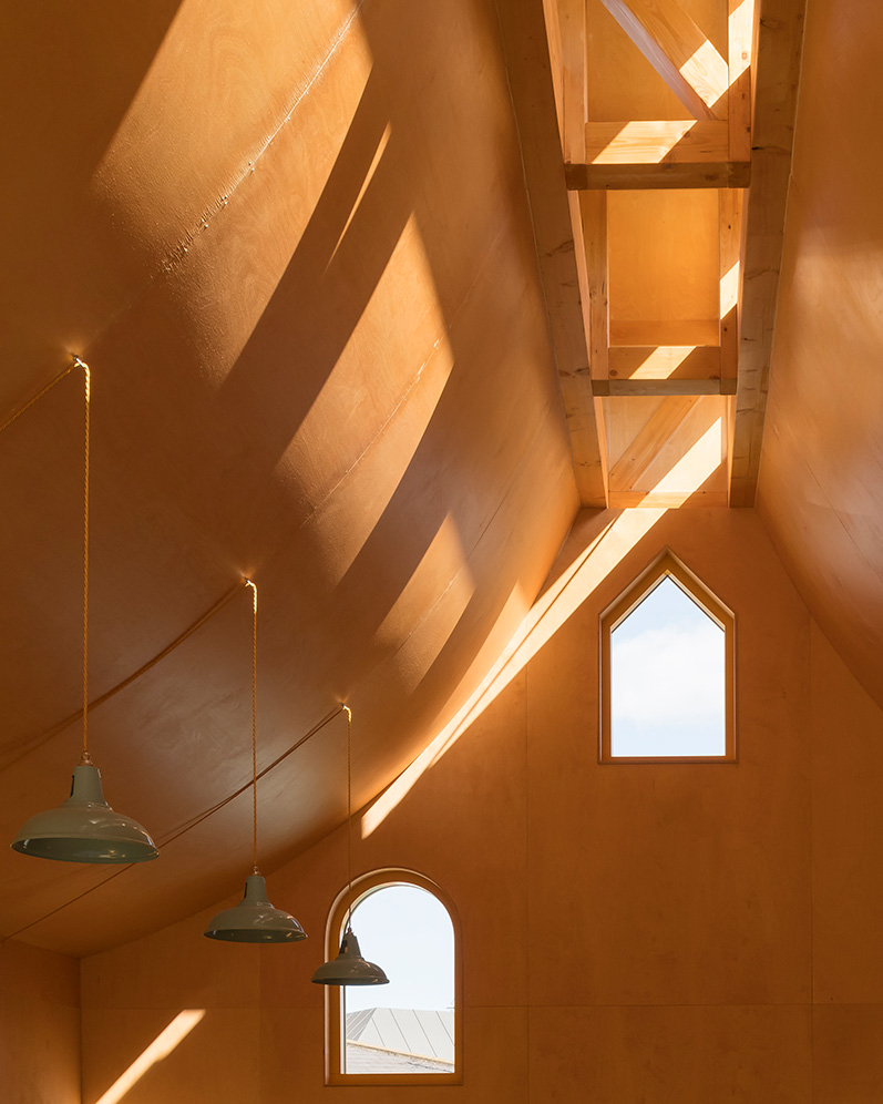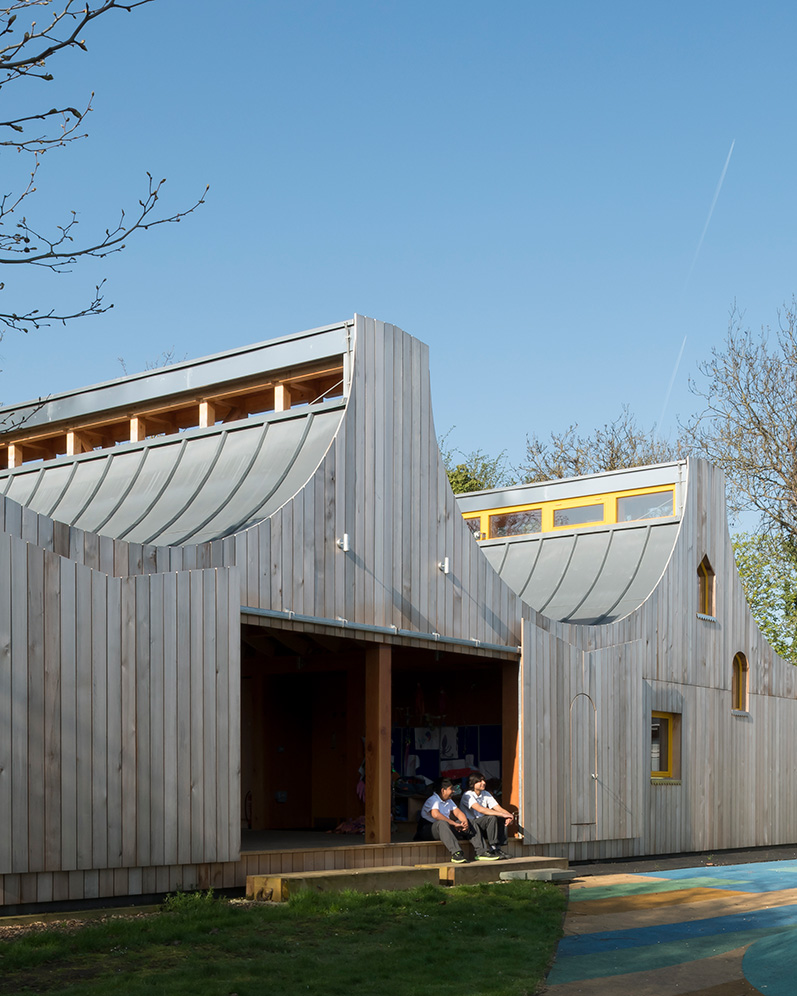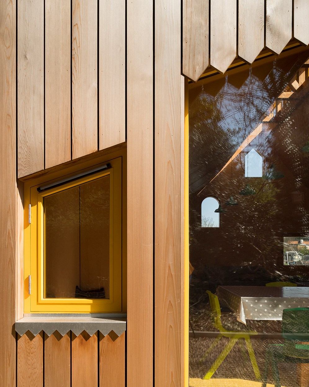 The structural frame is constructed using larch, with exterior cladding made from cedar. Internally, birch plywood gives the school a light and airy feel. As a further nod to the world of fairytales, the building has angular windows finished with sawtooth fascia boards and windowsills. Two sliding shutters can be drawn across the main entrance as required, and the pupils can then use the inset smaller doors which, like the concave roof, take the mind off to another world of castles and secret passages.