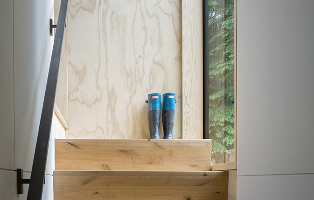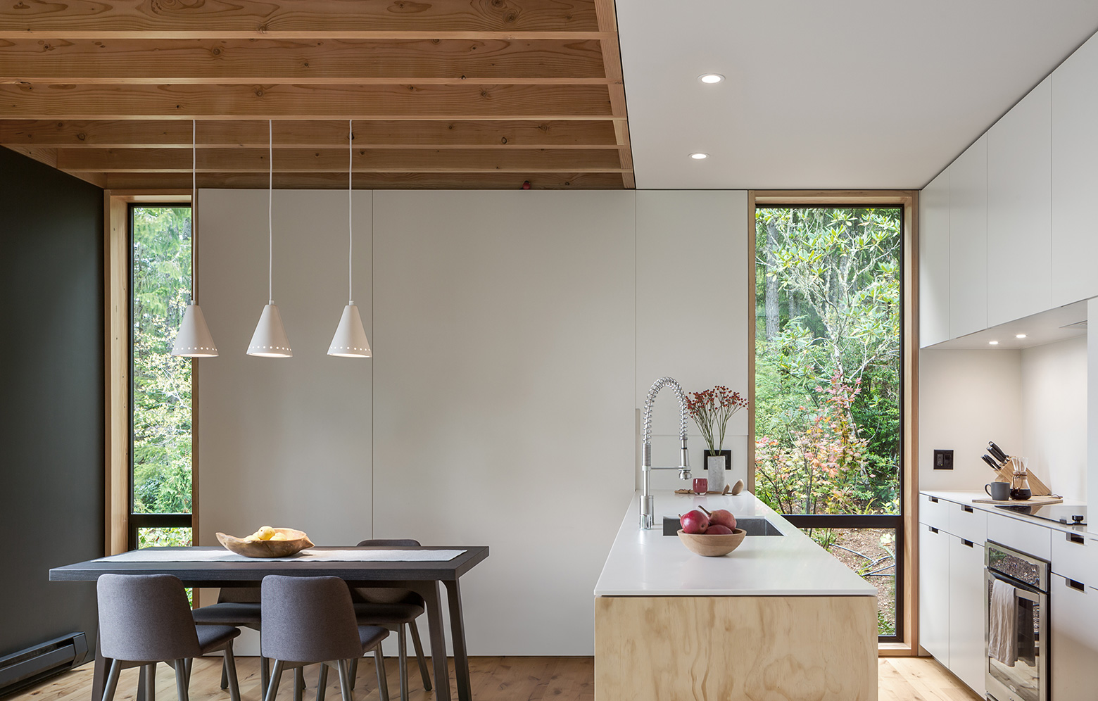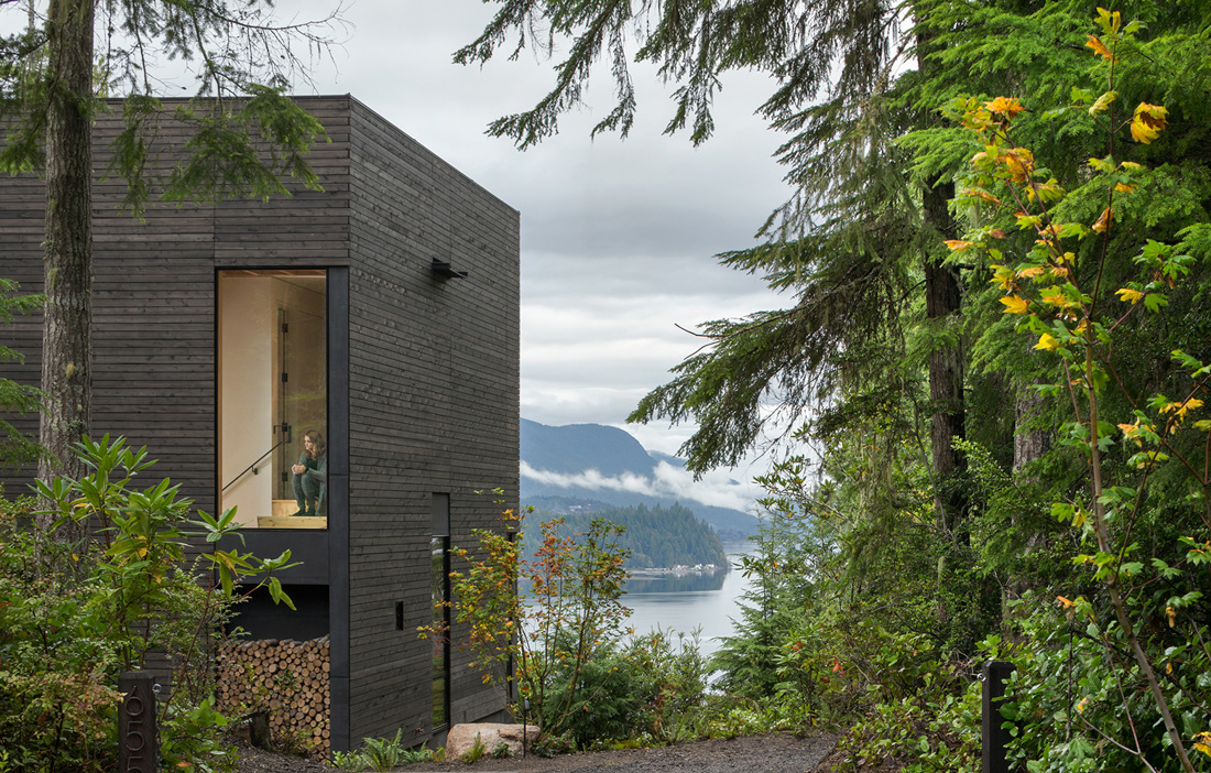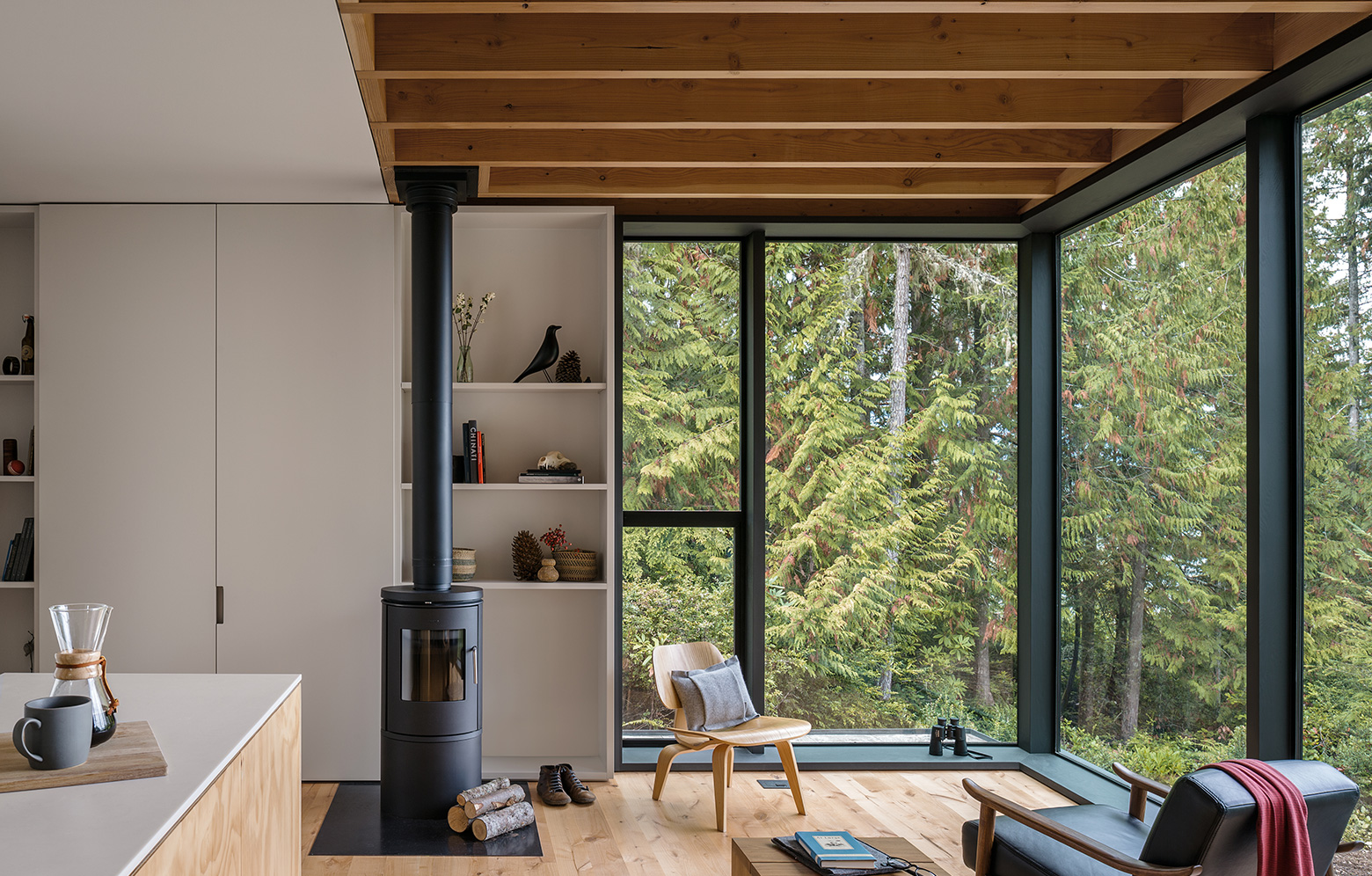 The design draws on the traditional A-frame cabin, known for its simple structure, angled roof and sloping walls. By twisting the roof 45°, the architects have generated extra space which, in addition to creating an exciting design, means that there is room for a sleeping loft within the 17 square metre floorplan.