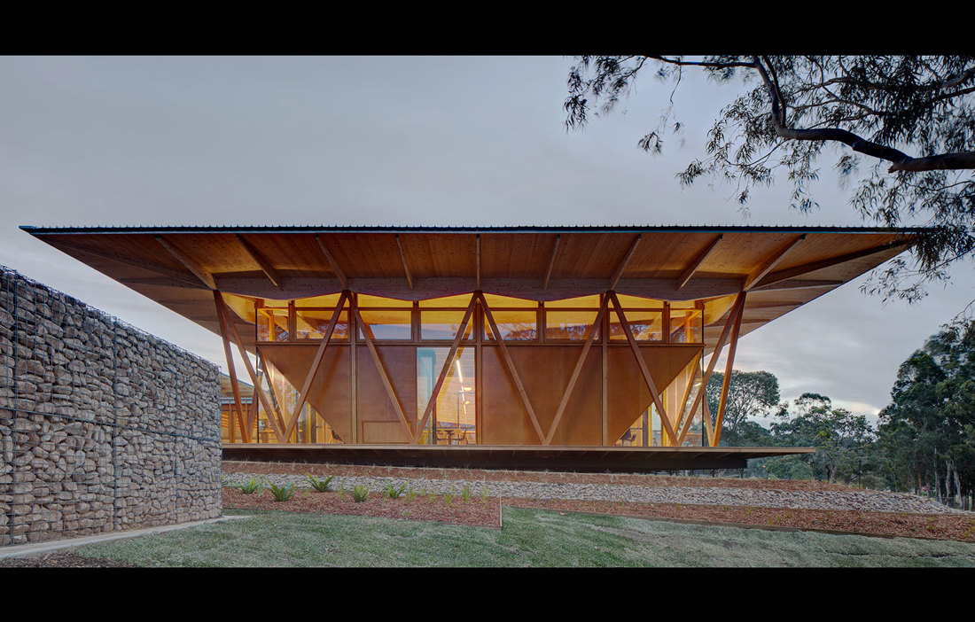 41 pairs of glulam posts made from Australian ash run all the way around the building. The external walls are made from plywood, and the interior walls are acoustic plywood panels with a veneer of Australian pine. The ceiling is lined with long, gently wave-shaped, glulam beams that taper at the ends. The architects wanted the ceiling to expose and express the building’s structural forces. The beams are curved because in different places they require more or less structural height to carry the weight of the roof.
