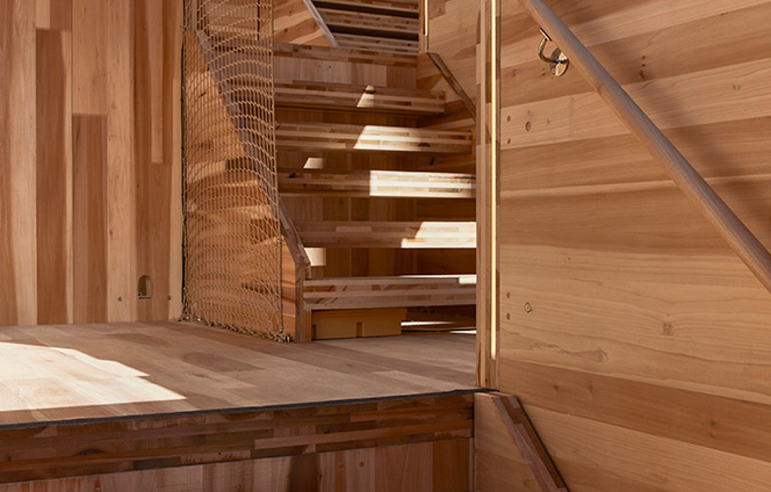The structure comprises 17 connected modules, produced from 102 CLT panels, which were manufactured in the UK for the first time. The American tulip wood – chosen for being stronger than spruce – was, of course, imported from North America, but the CLT panels were then manufactured in a newly opened Scottish research factory. To further improve strength and stability, the wood in the upper panels has been heat-treated, which makes the material less susceptible to the weather and more water-resistant. Heat treatment is nothing new, but this is the first time it has been done on material that is then turned into cross laminated timber. The other panels are treated with a clear matt varnish.
