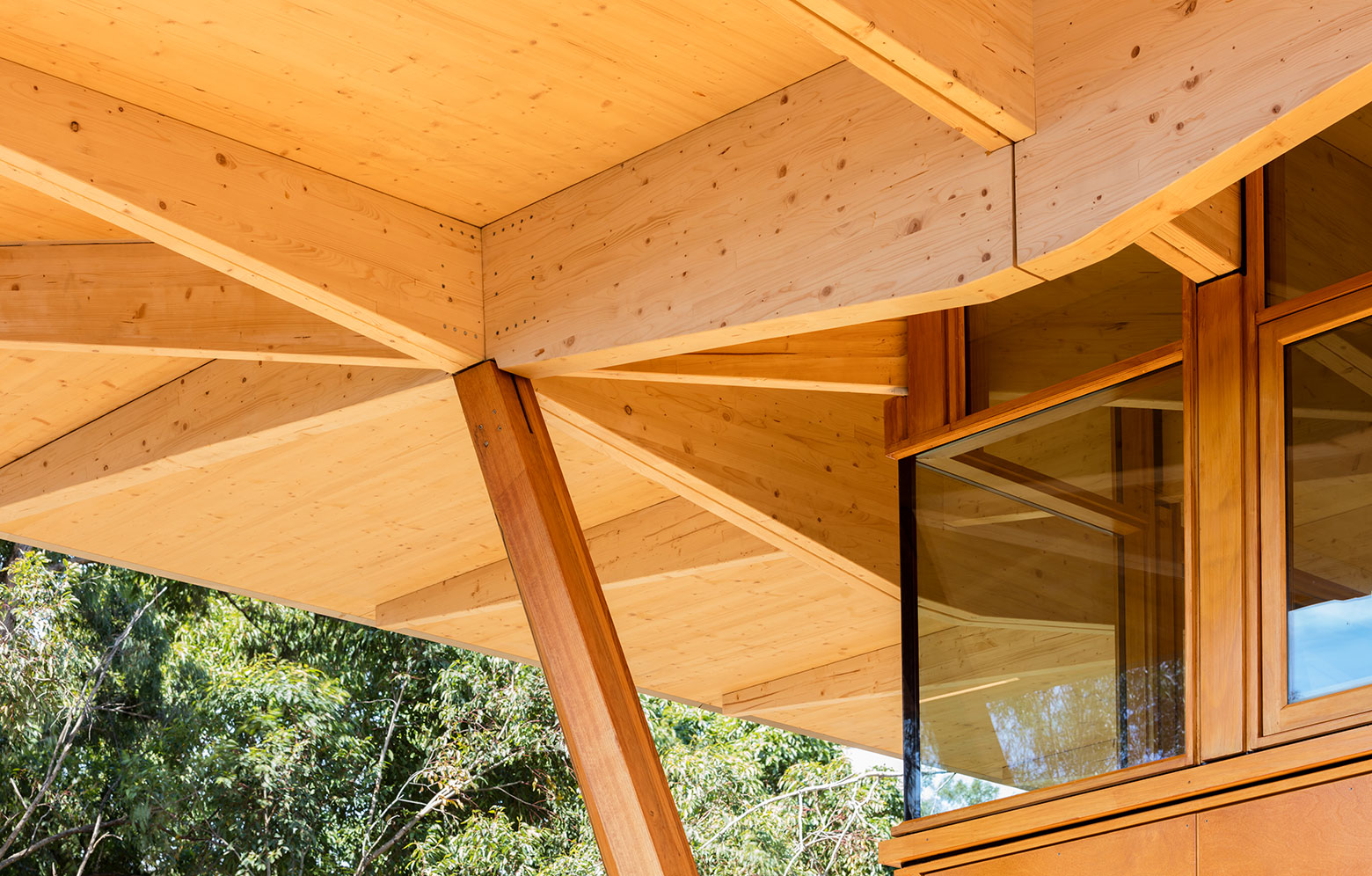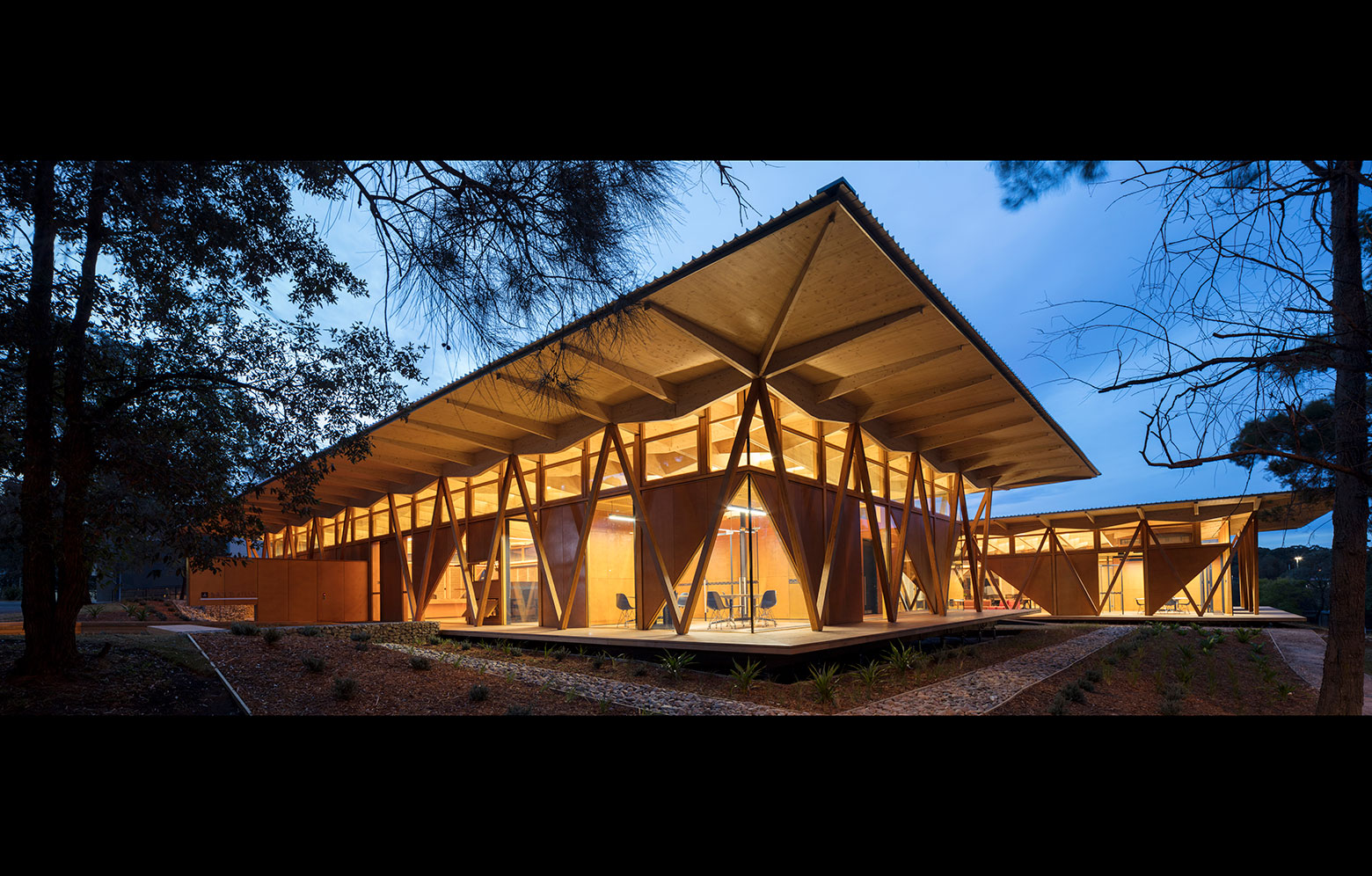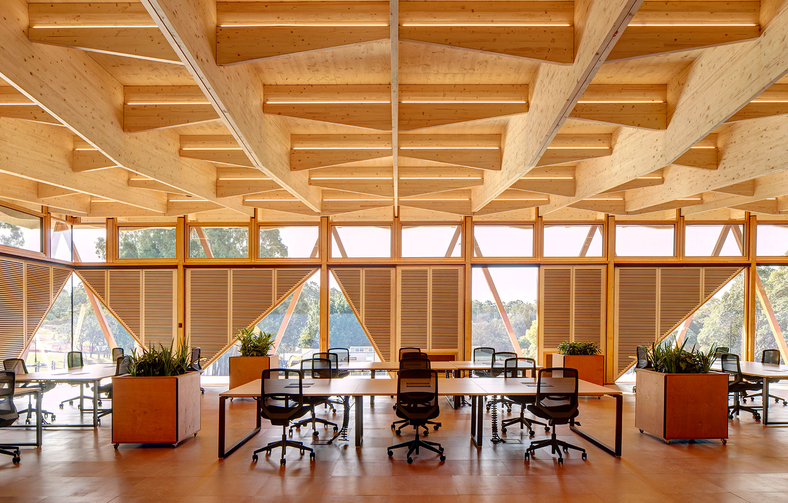 41 pairs of glulam posts made from Australian ash run all the way around the building. The external walls are made from plywood, and the interior walls are acoustic plywood panels with a veneer of Australian pine. The ceiling is lined with long, gently wave-shaped, glulam beams that taper at the ends. The architects wanted the ceiling to expose and express the building’s structural forces. The beams are curved because in different places they require more or less structural height to carry the weight of the roof.